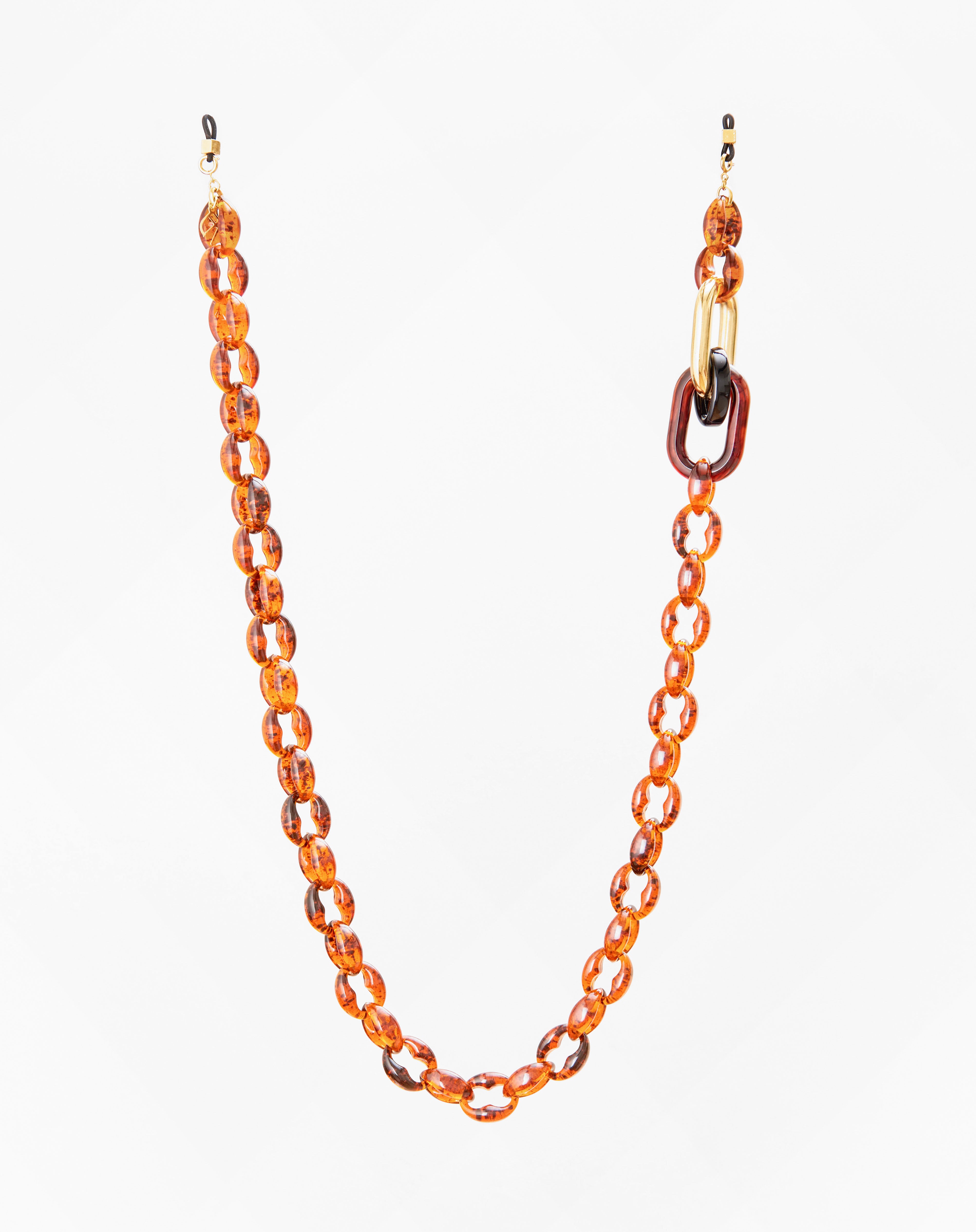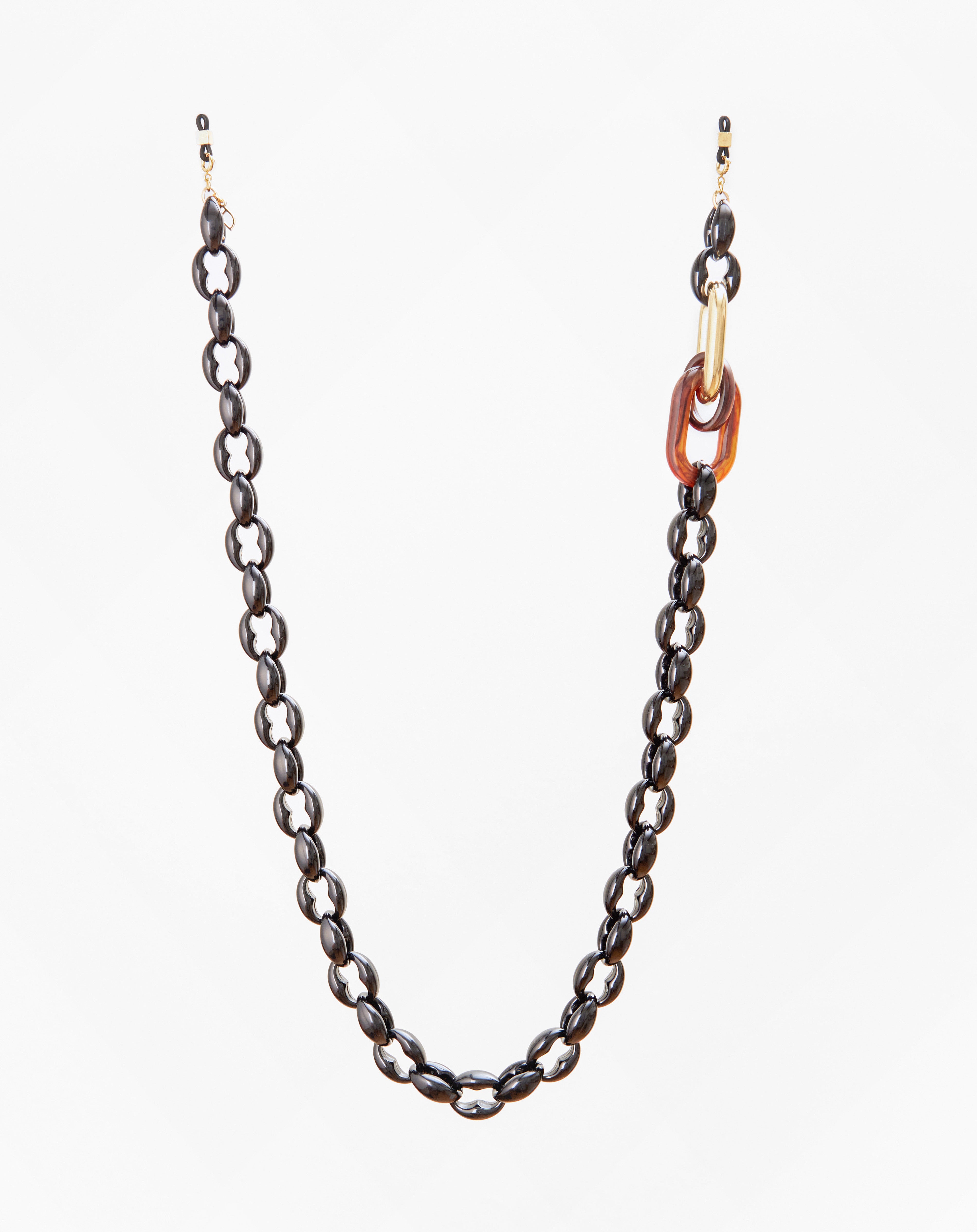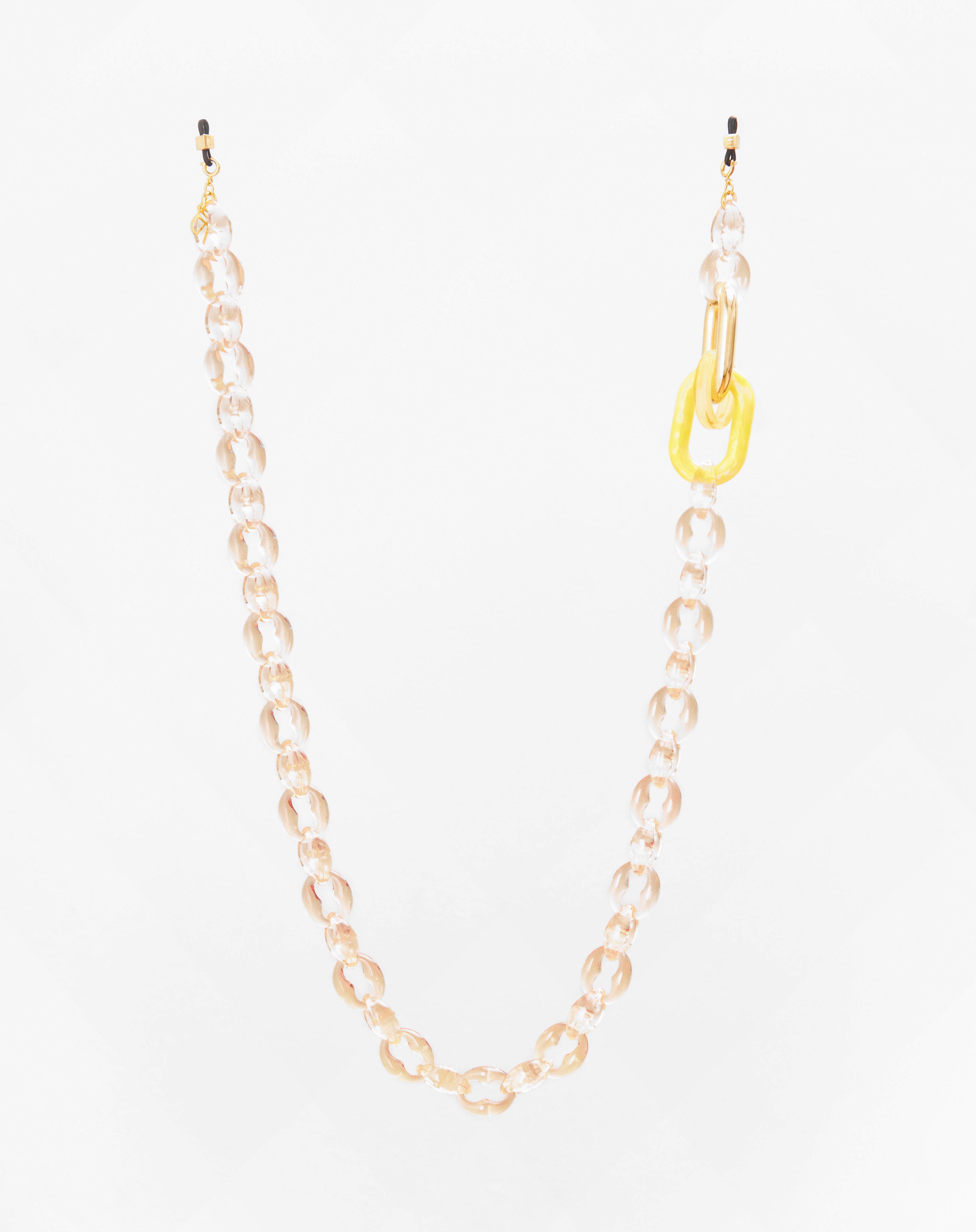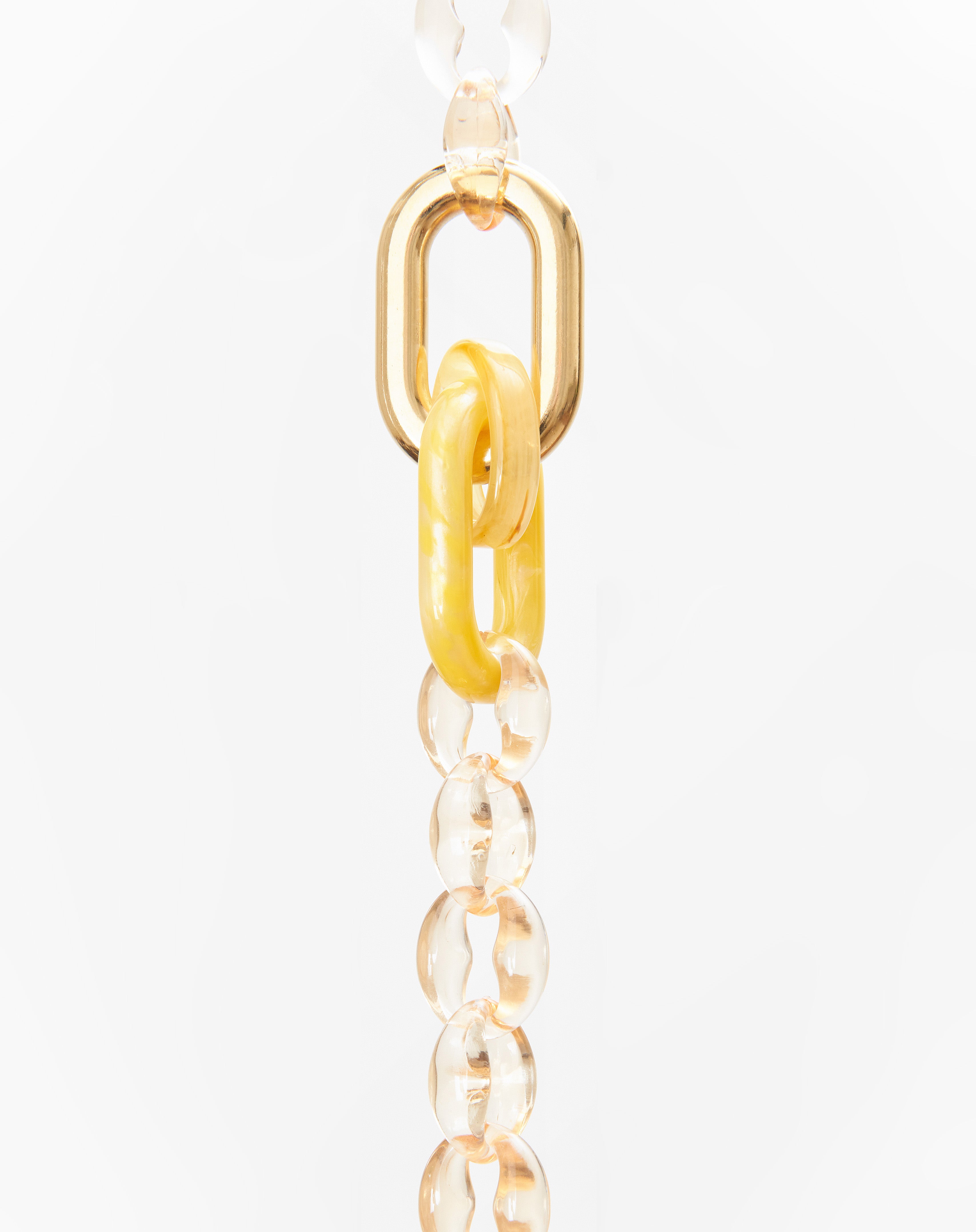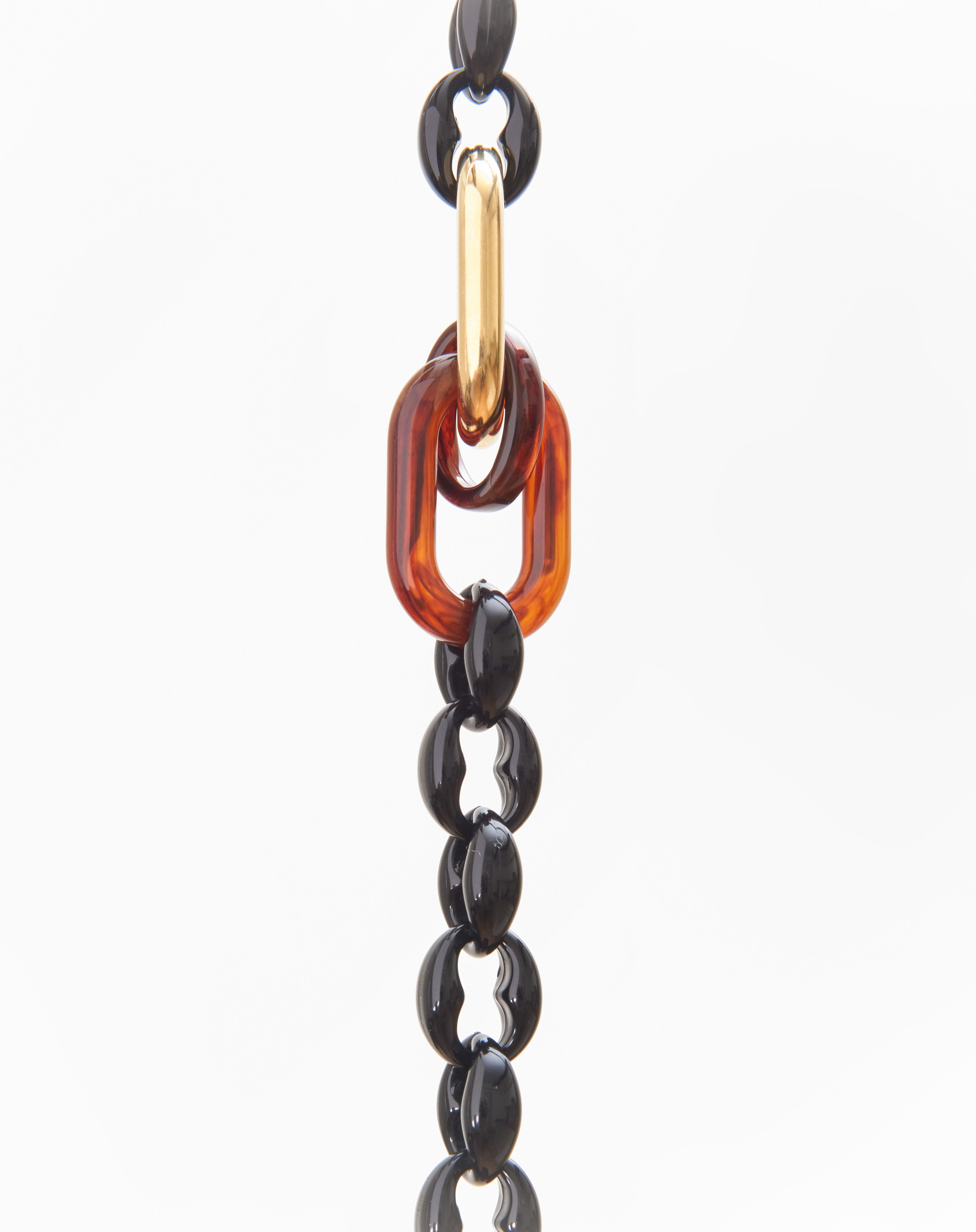 Emmanuelle Khanh imagines a new accessory composed of a marine chain inserted in three links, one of which is gilded with fine gold. Its manifest side makes this chain round and elegant. Chain length: 85cm. Designed and handcrafted in France.