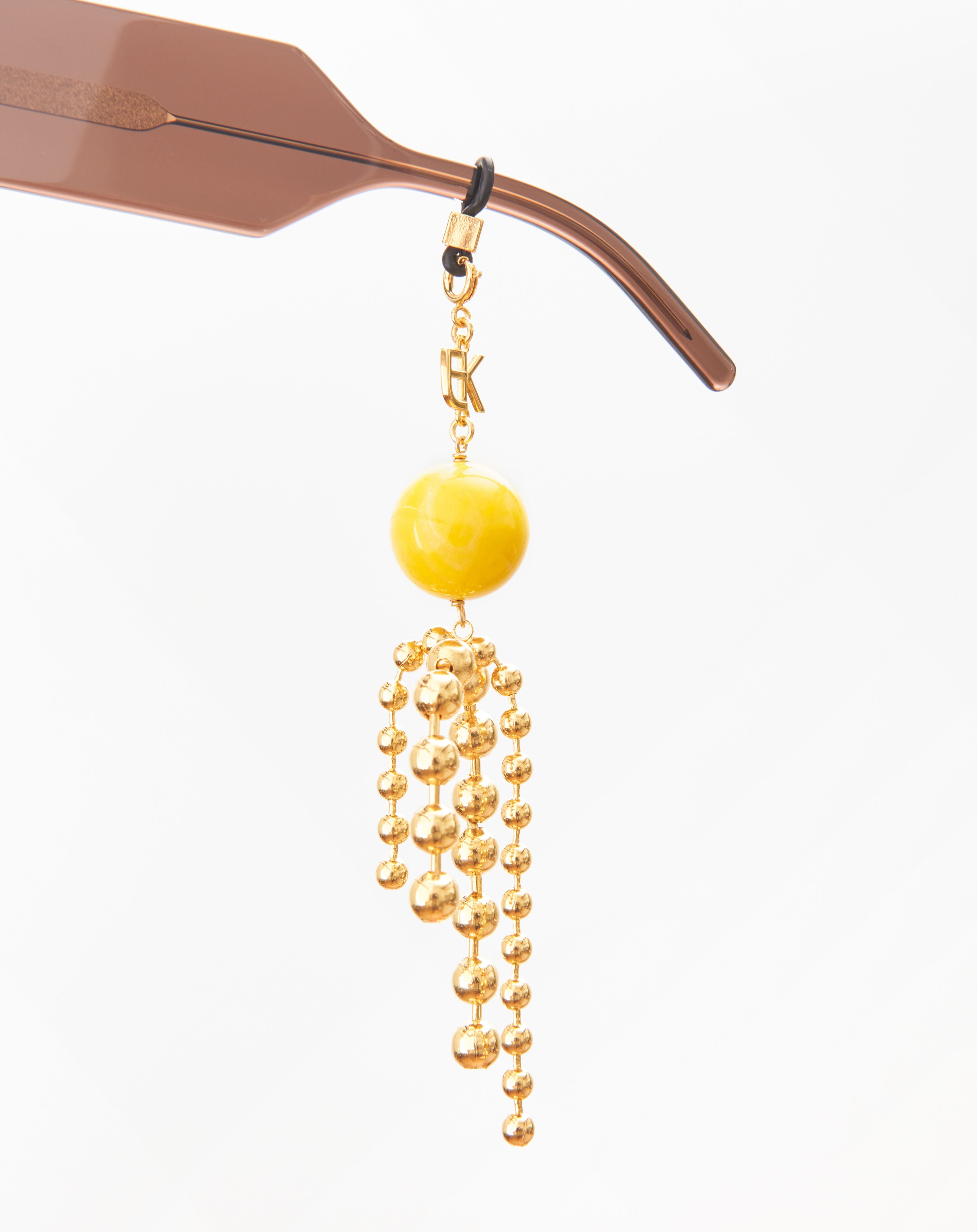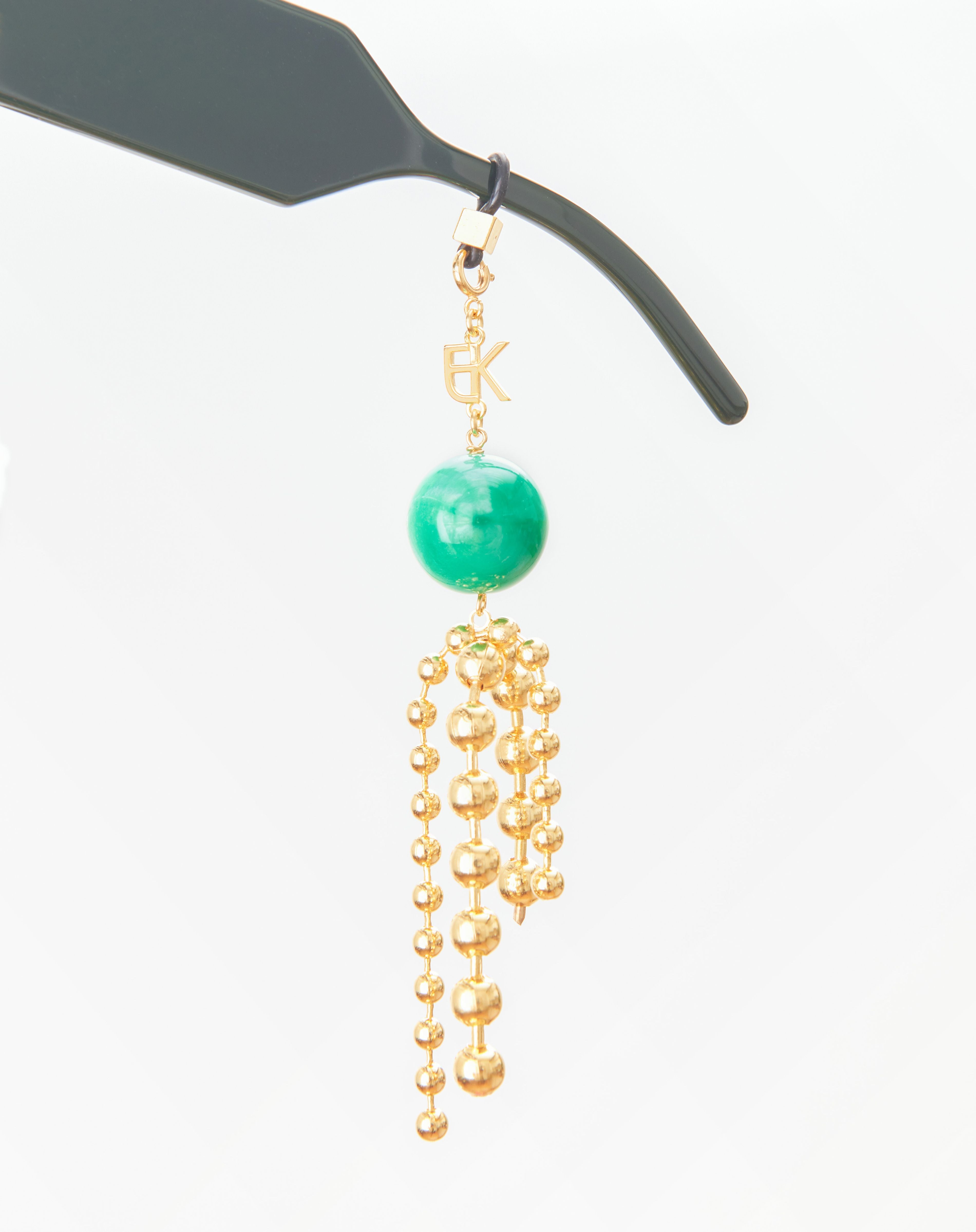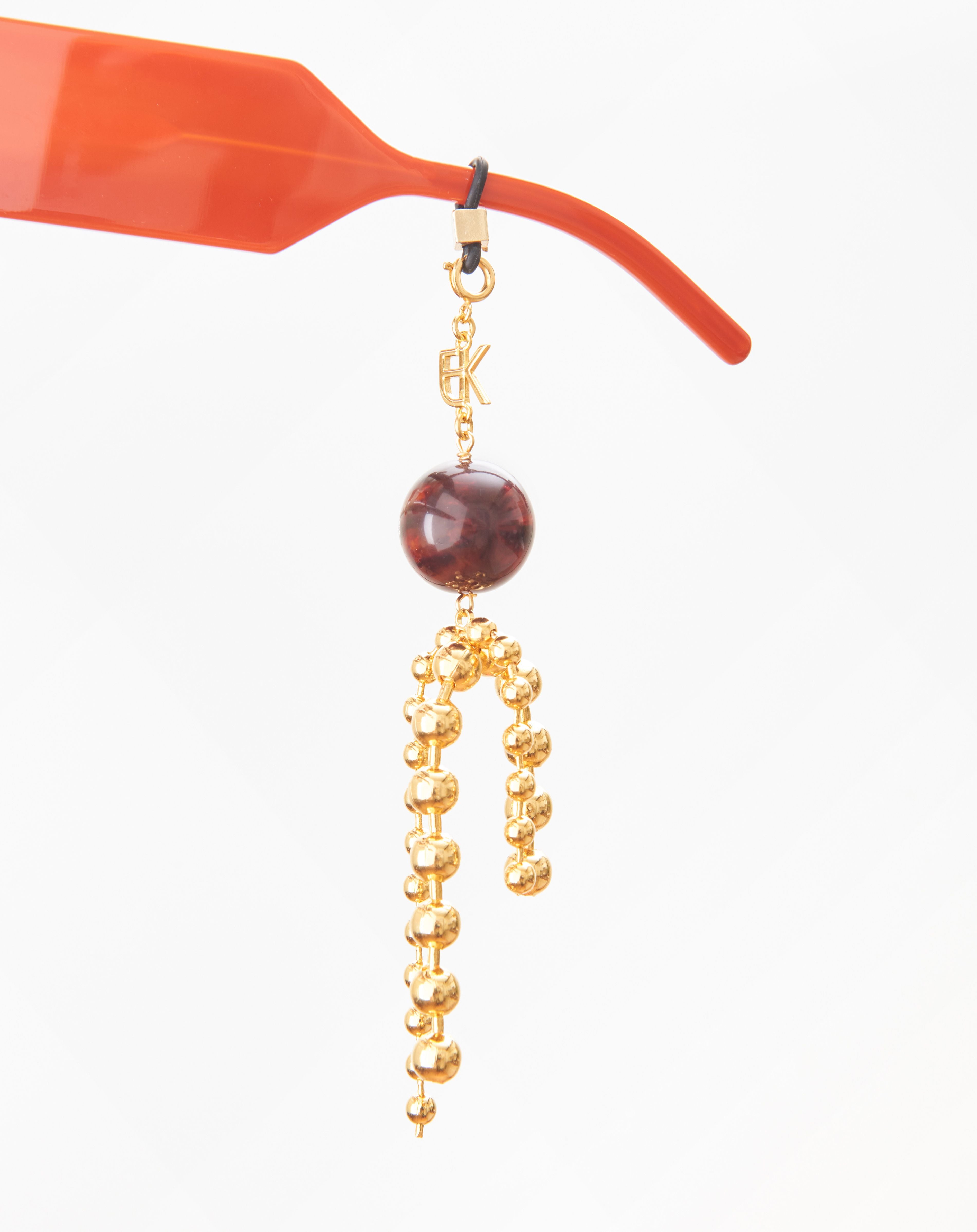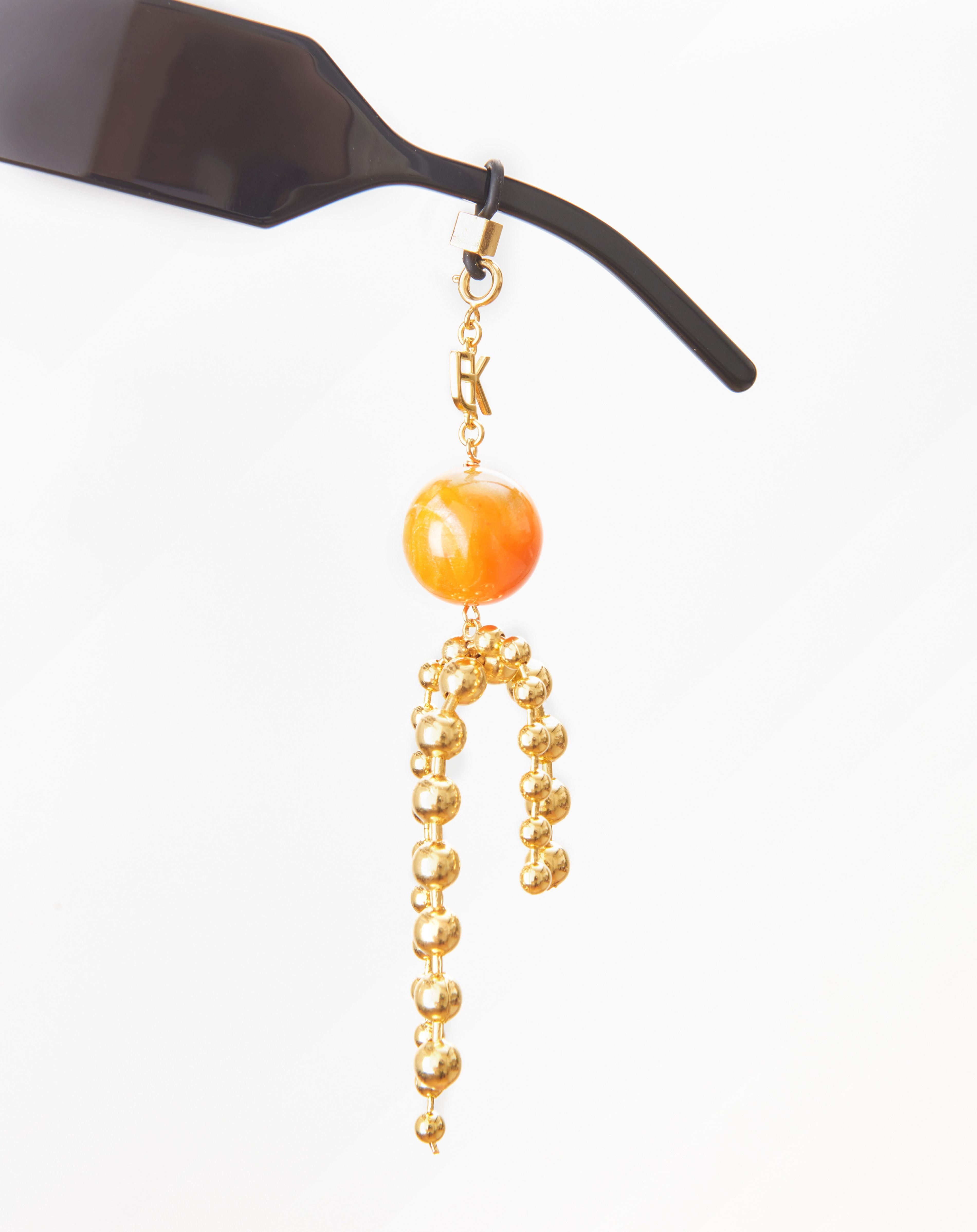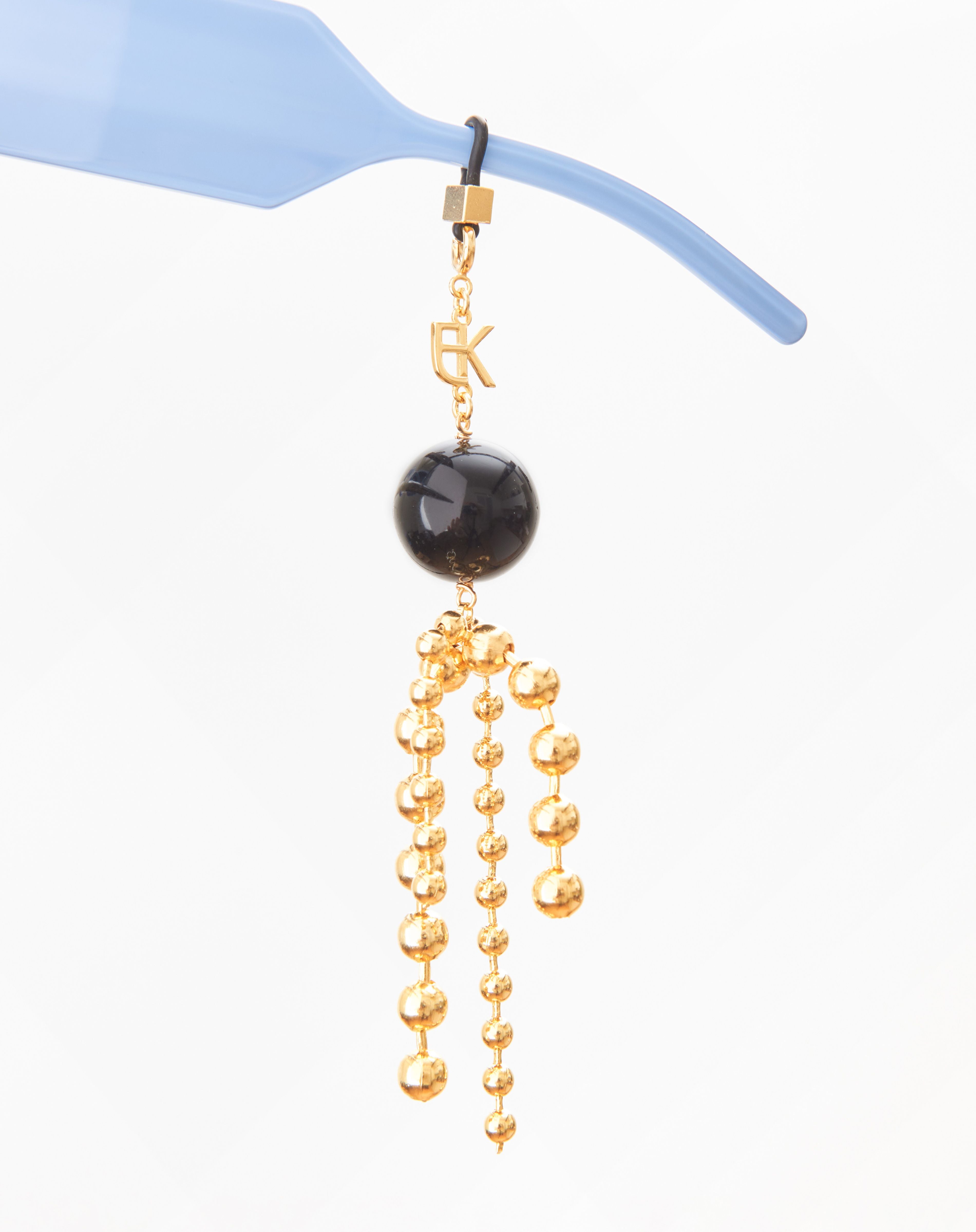 Emmanuelle Khanh imagines a bi-material temple jewel combining a chain of globes gilded with fine gold and round pearls. This unique accessory continues to explore a jewel dimension. Length: 12cm. Designed and handcrafted in France.