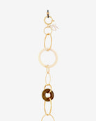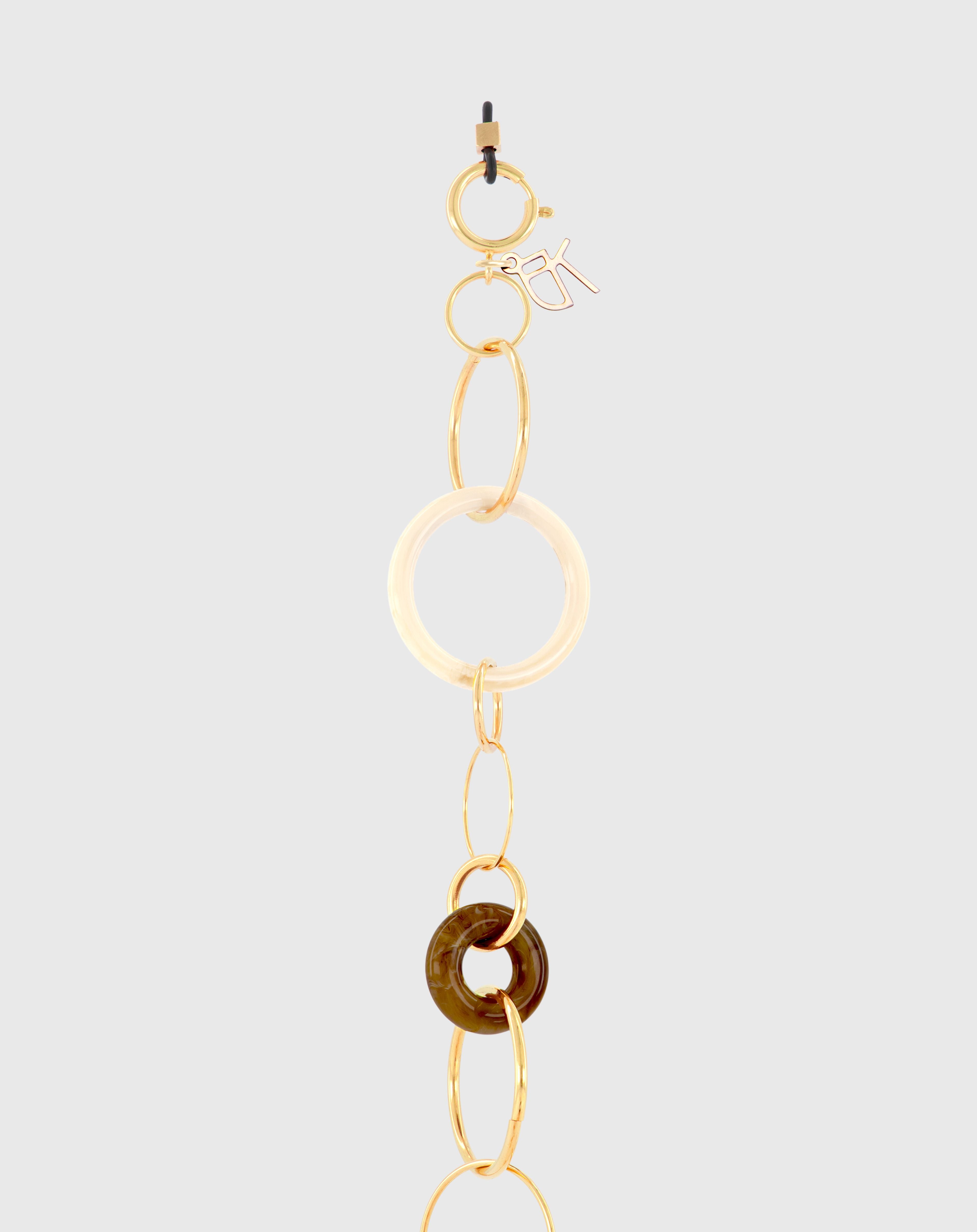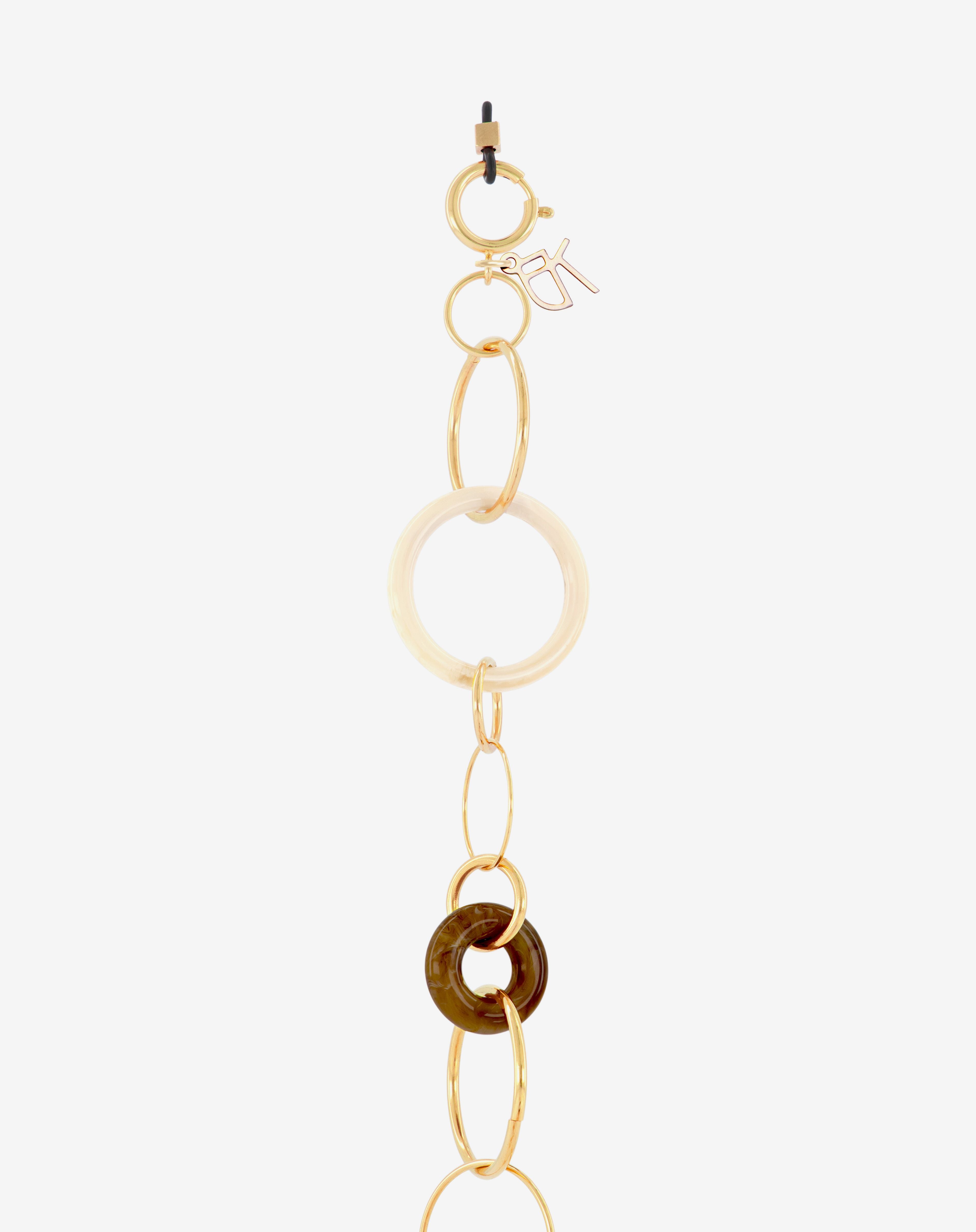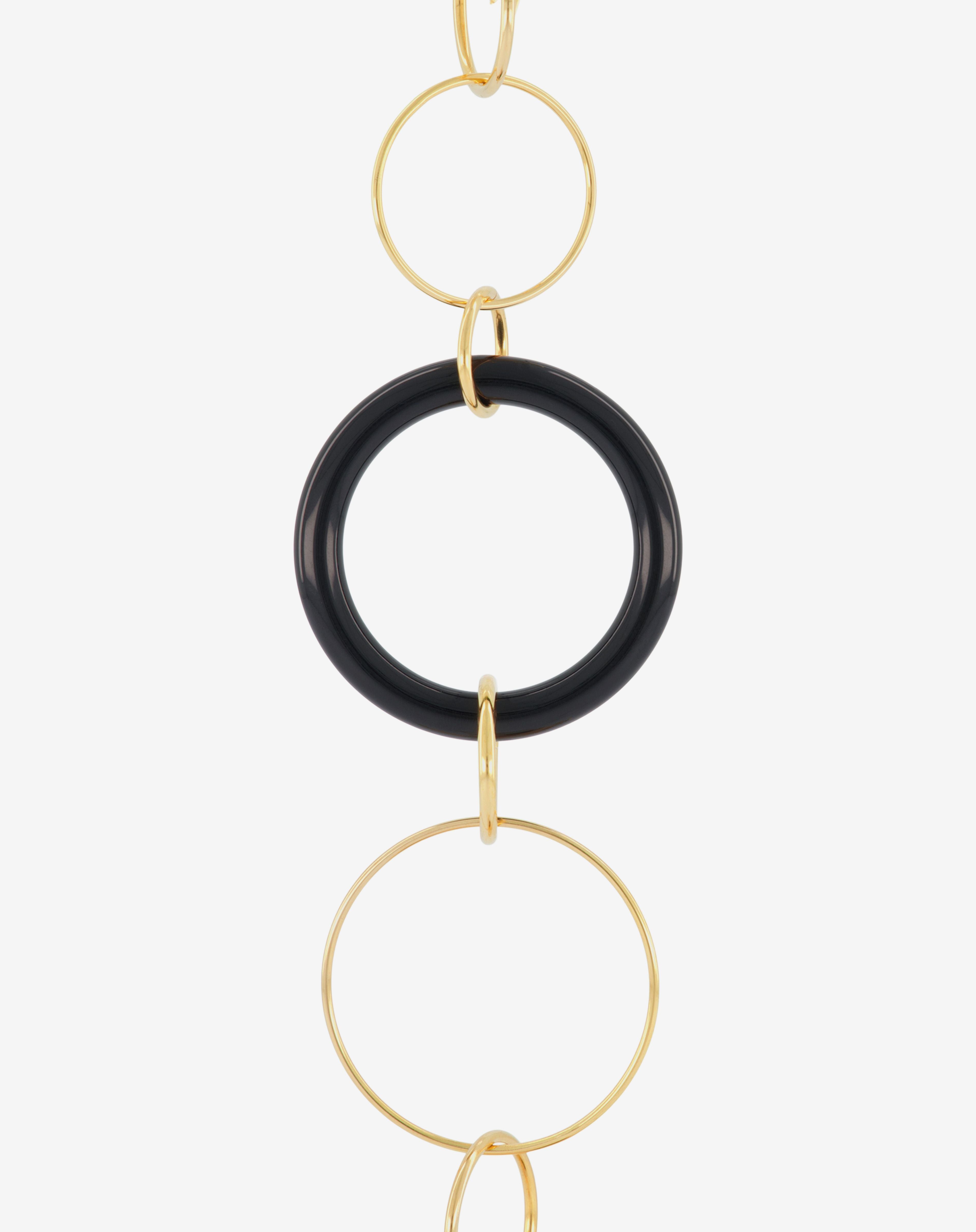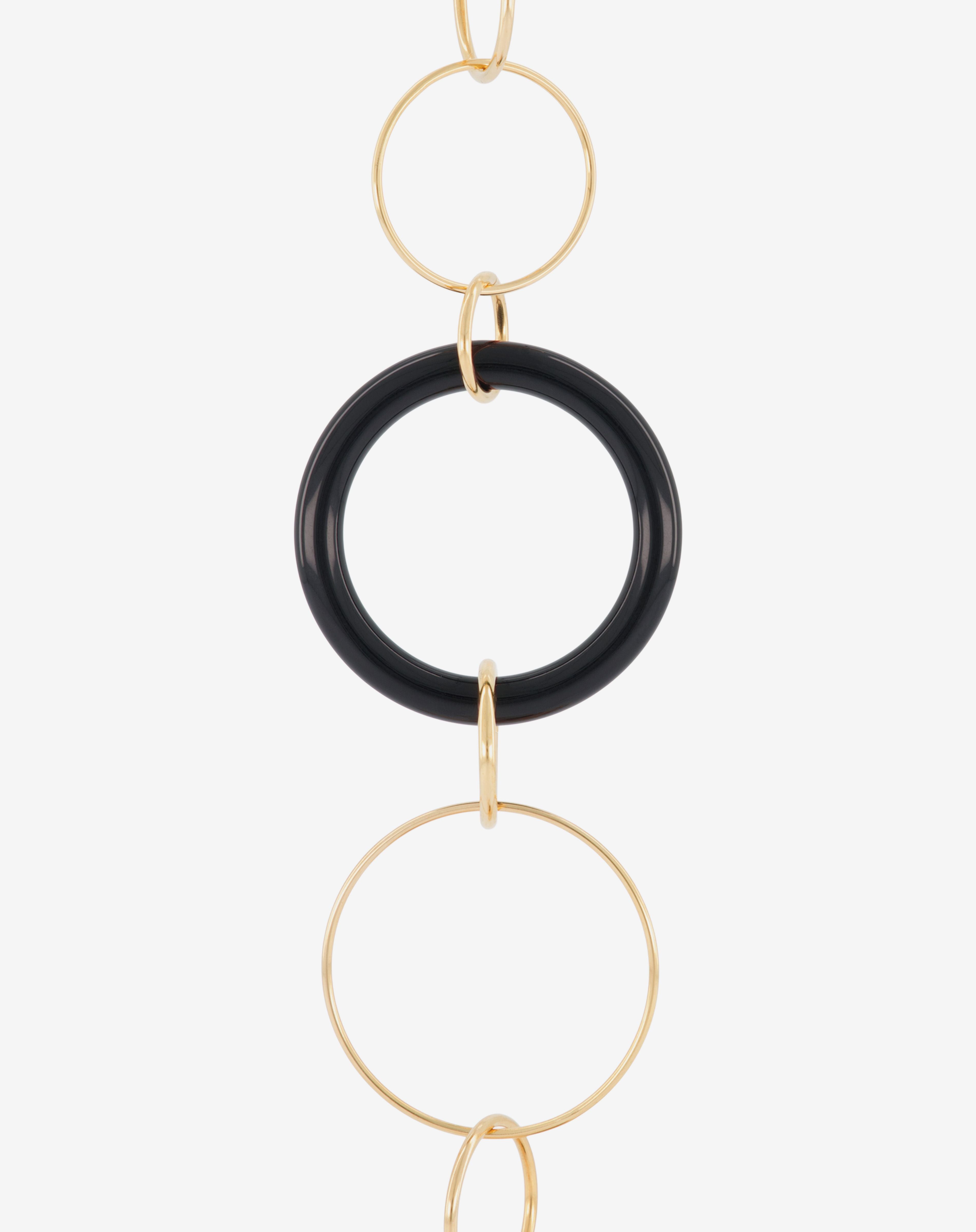 Emmanuelle Khanh imagines an unique jewel acessorie combining hand-welded brass chain and acrylic rings. Thanks to its clasps, the chain continues to explore a necklace aspect. Chain length: 80cm. Designed and handcrafted in France.
