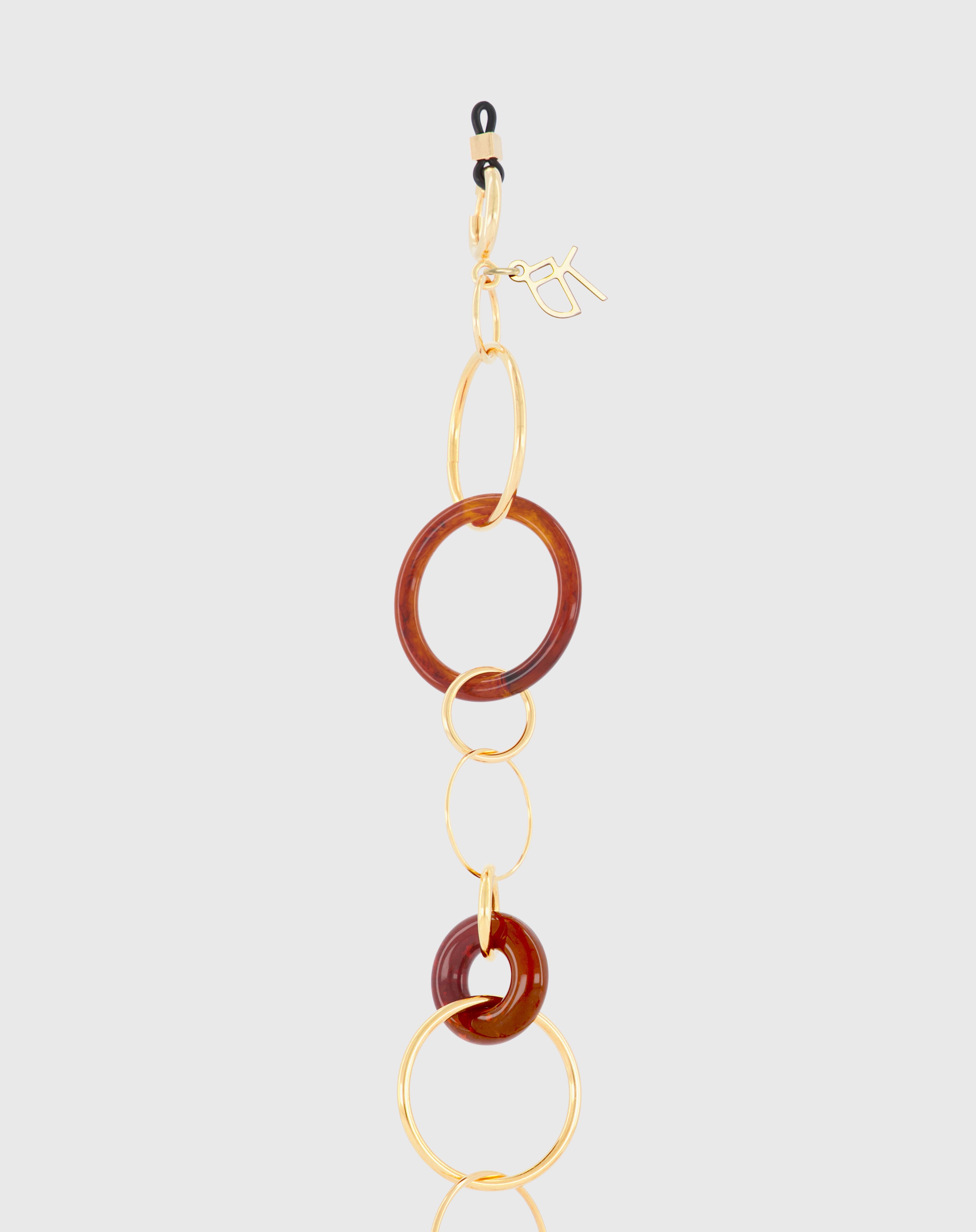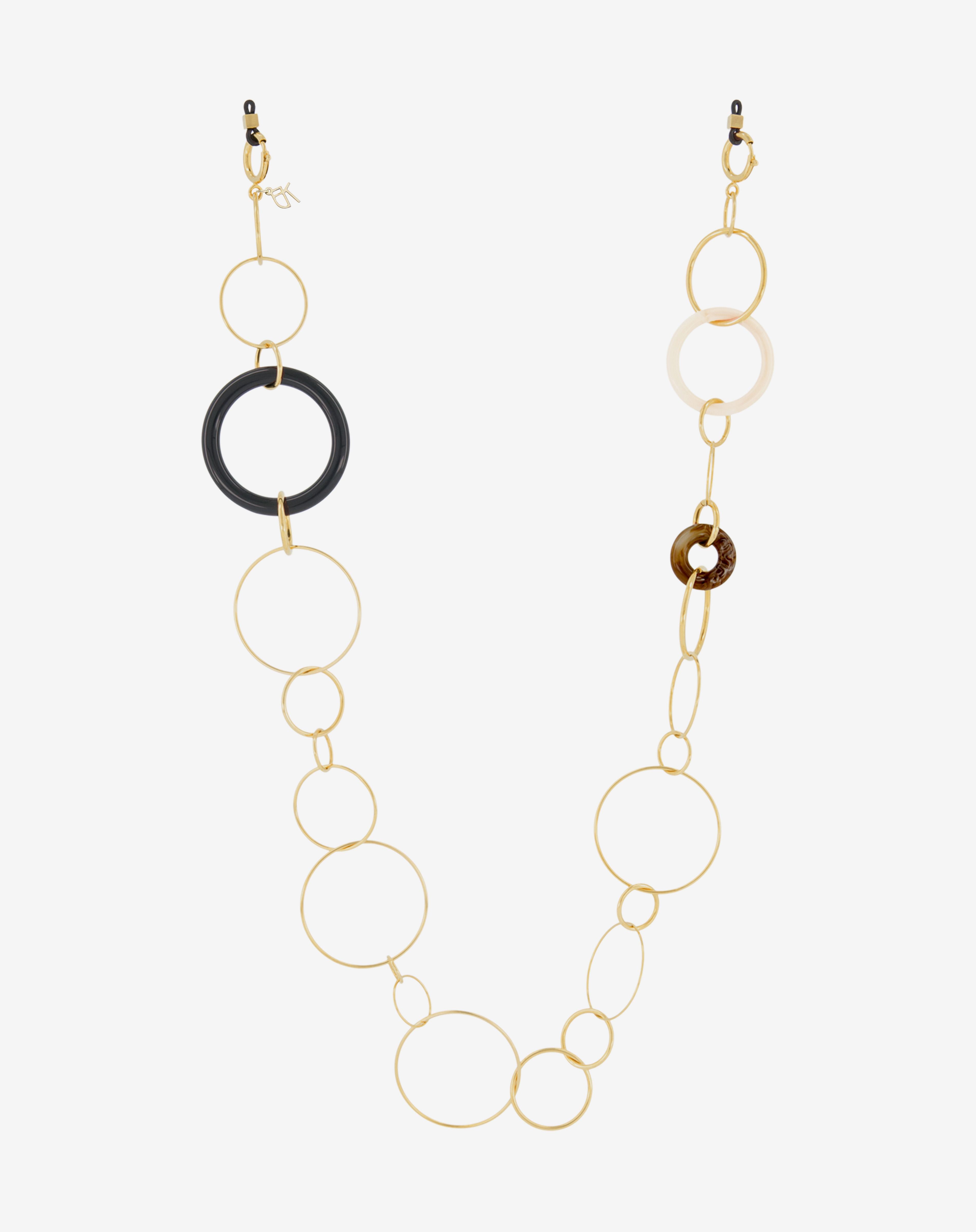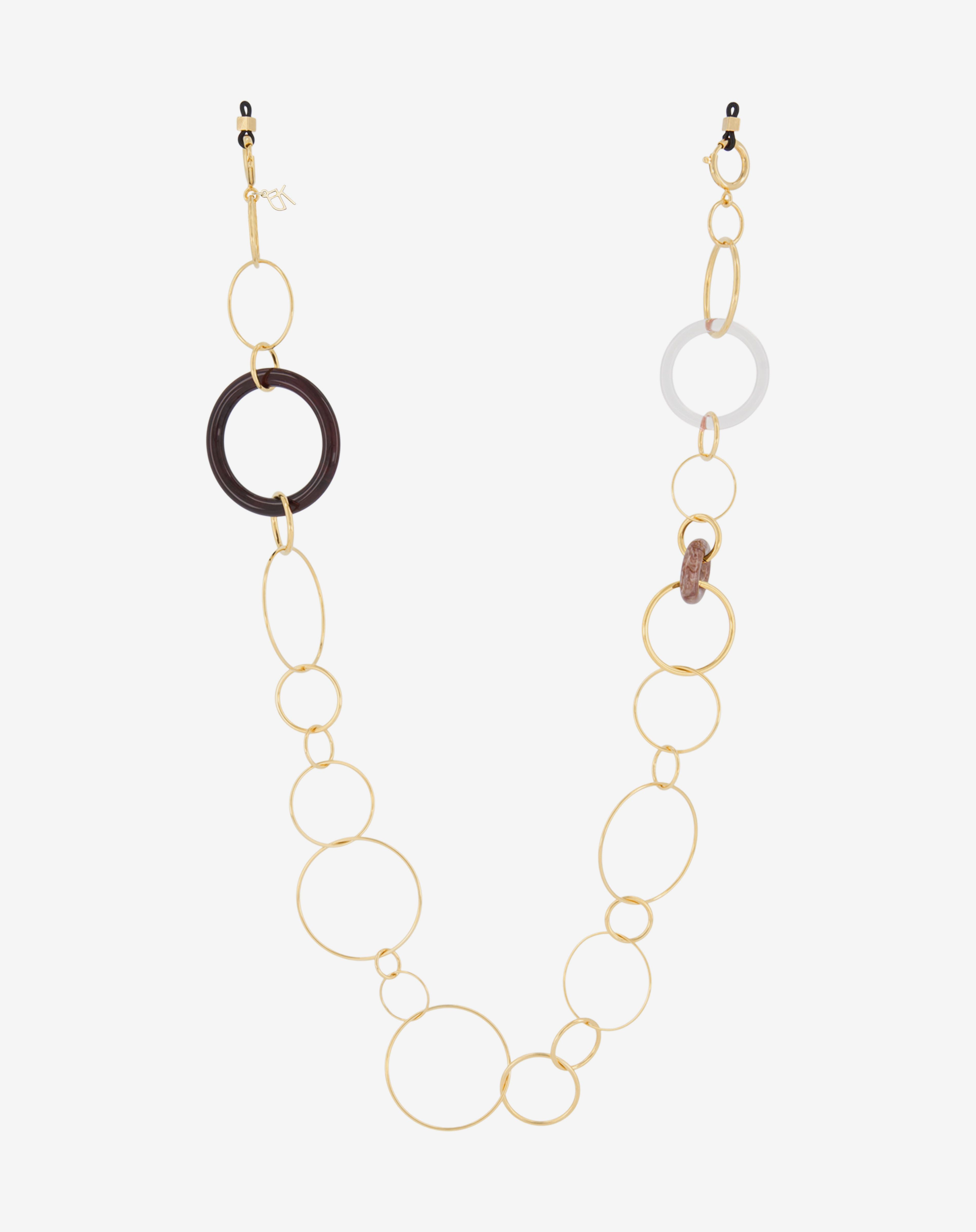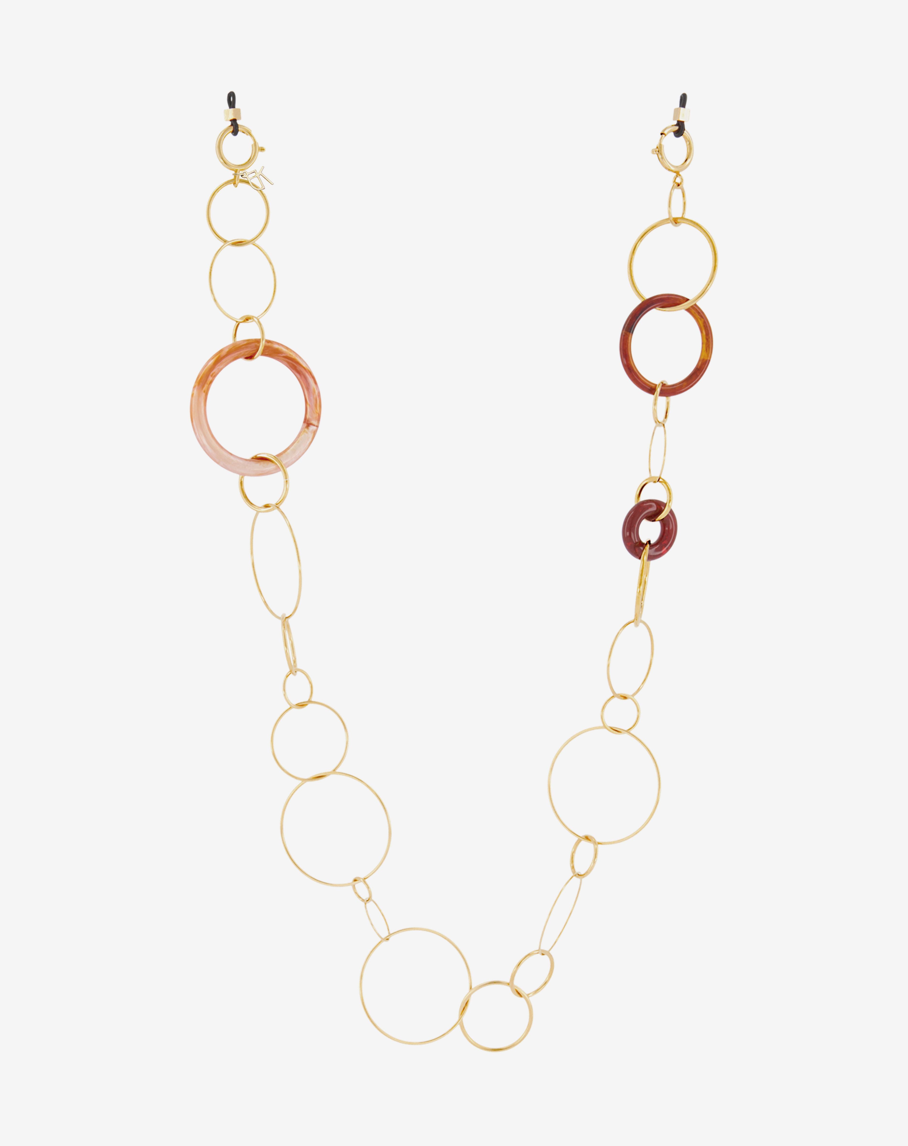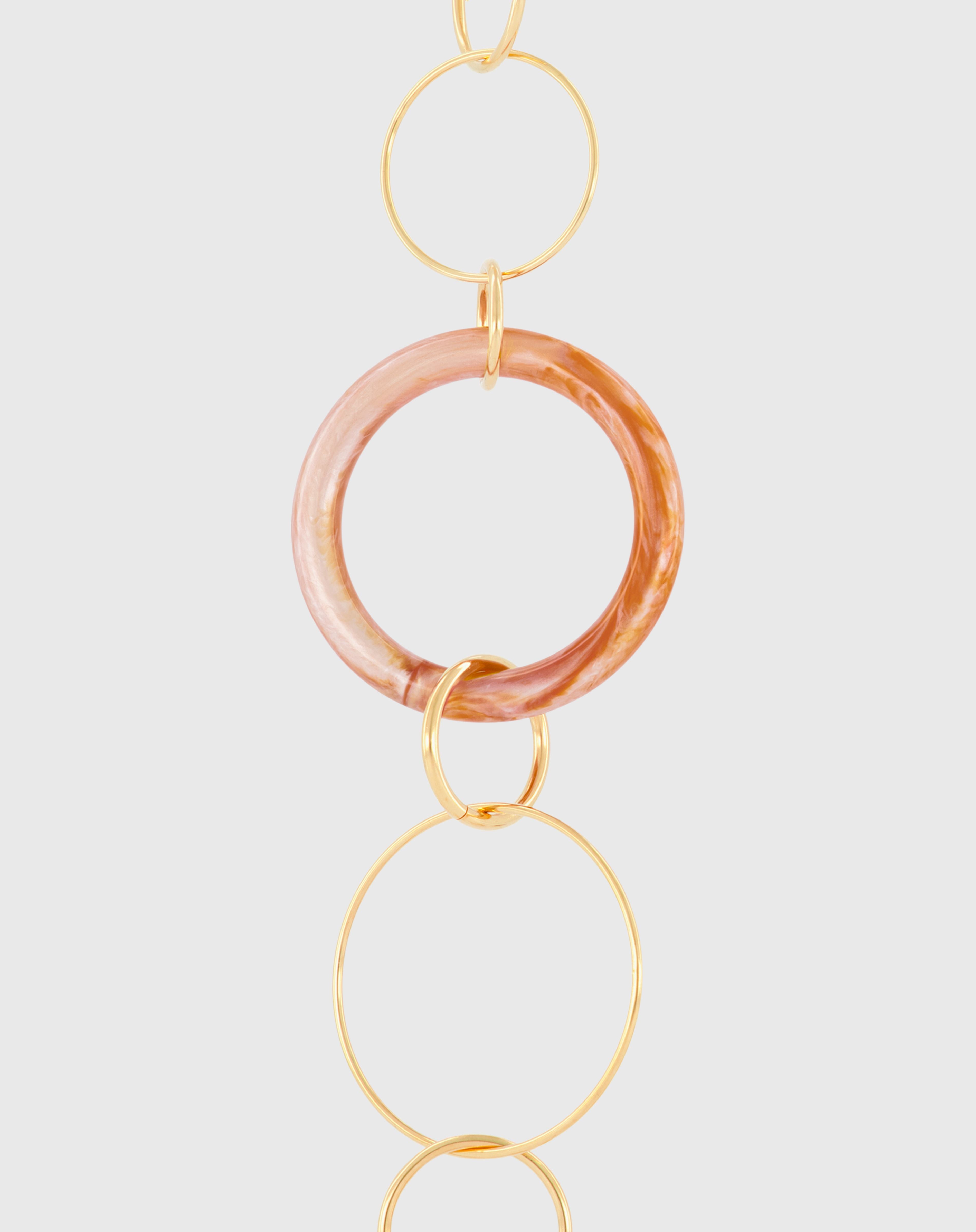 Emmanuelle Khanh imagines an unique jewel acessorie combining hand-welded brass chain and acrylic rings. Thanks to its clasps, the chain continues to explore a necklace aspect. Chain length: 80cm. Designed and handcrafted in France.