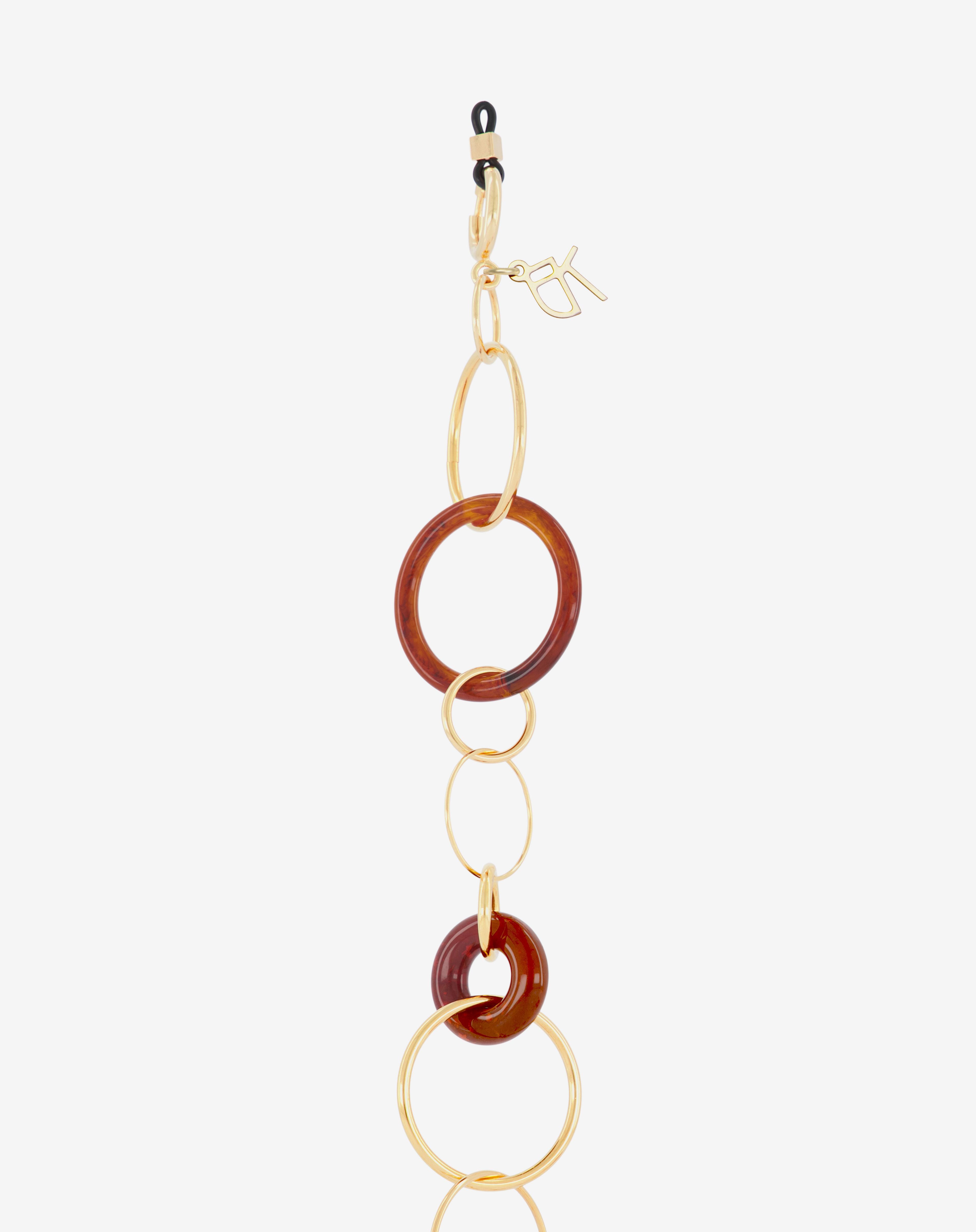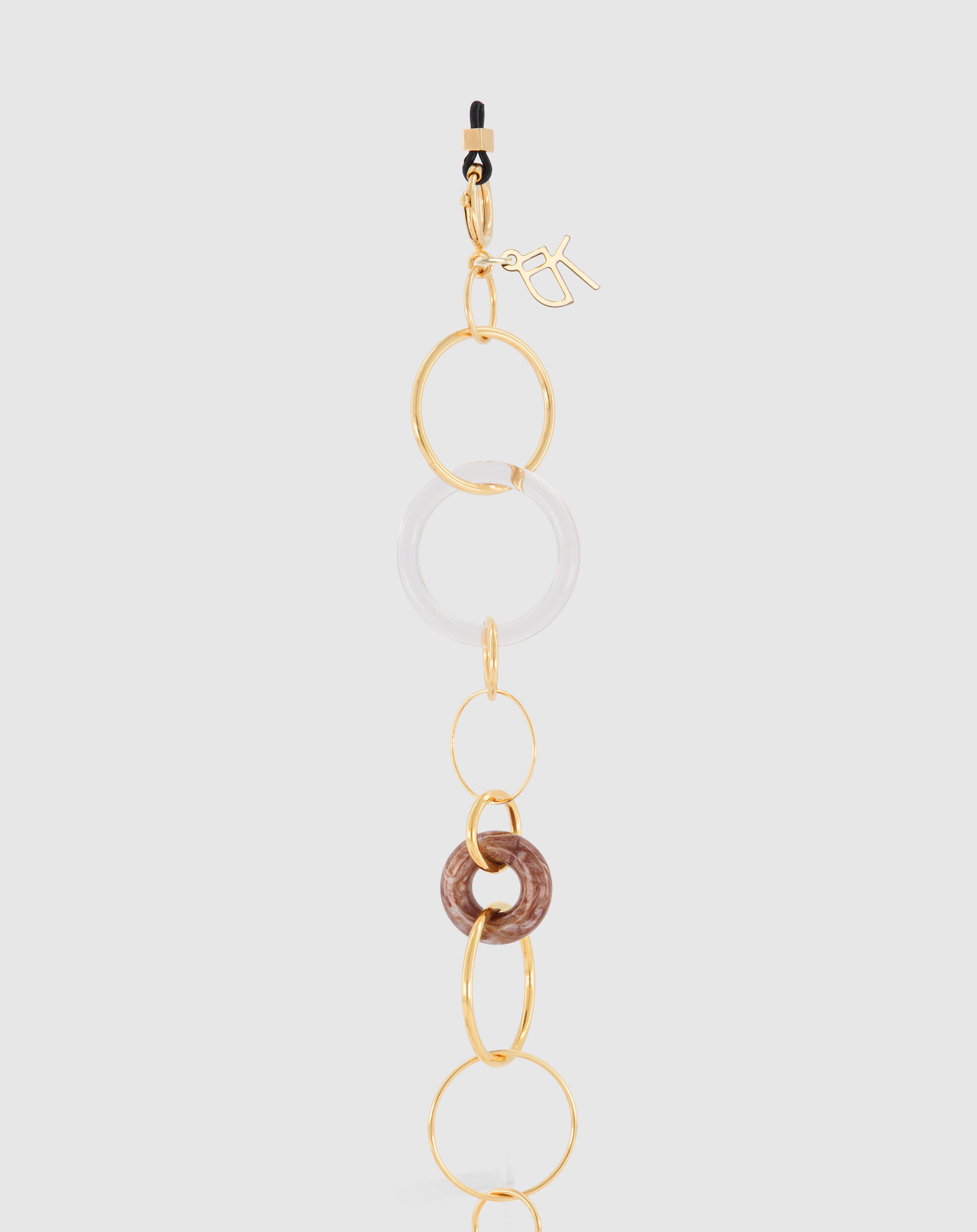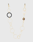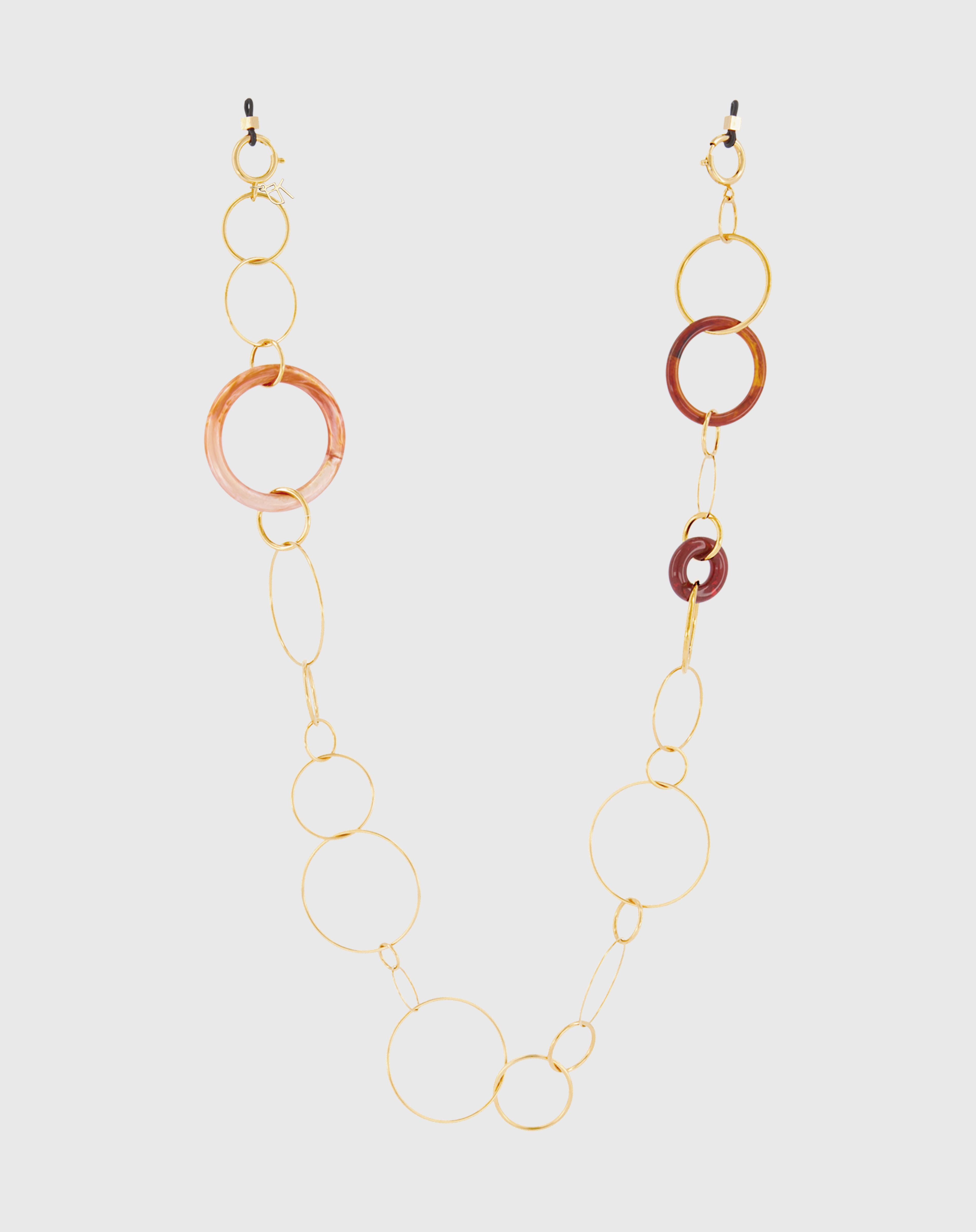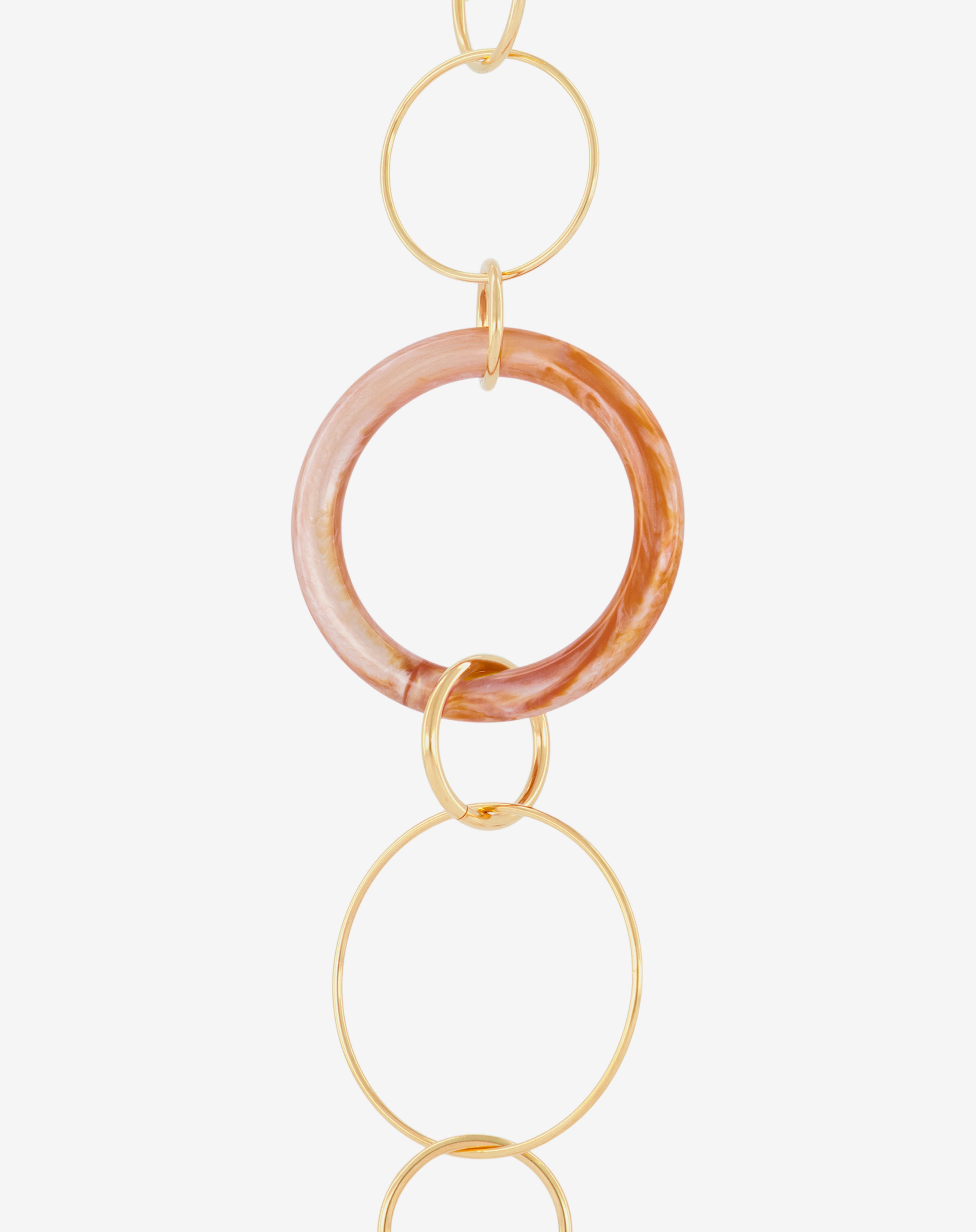 Emmanuelle Khanh imagines an unique jewel acessorie combining hand-welded brass chain and acrylic rings. Thanks to its clasps, the chain continues to explore a necklace aspect. Chain length: 80cm. Designed and handcrafted in France.