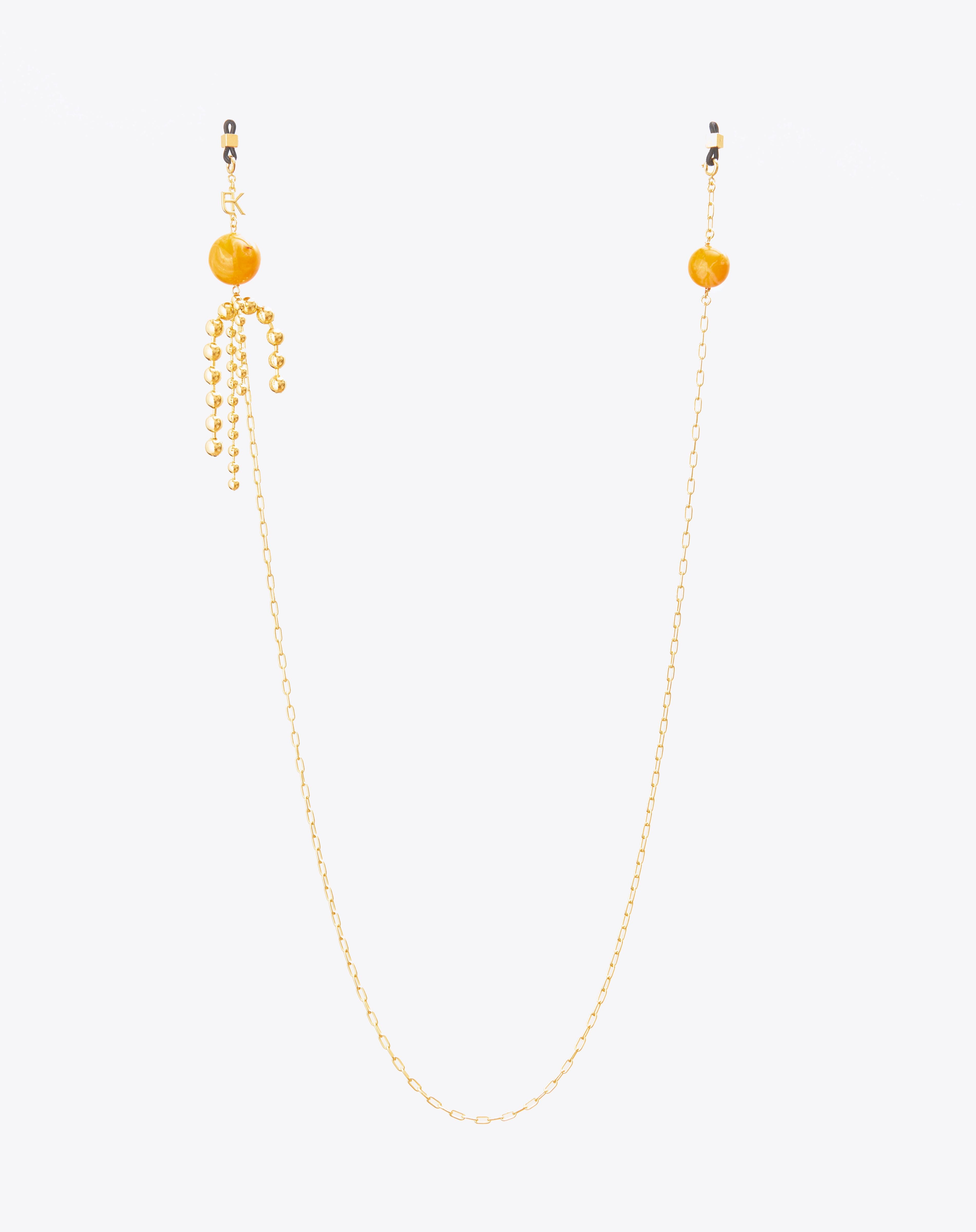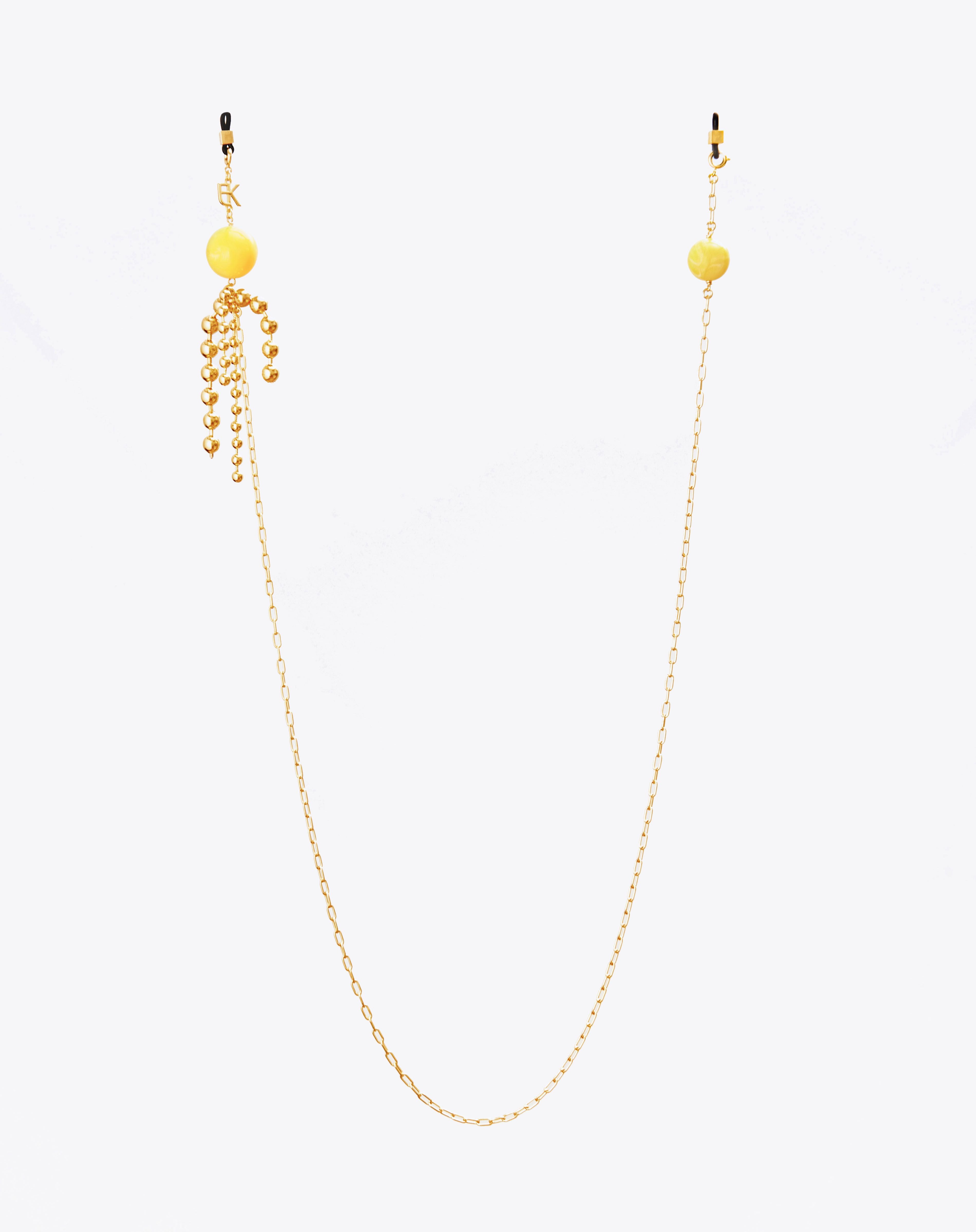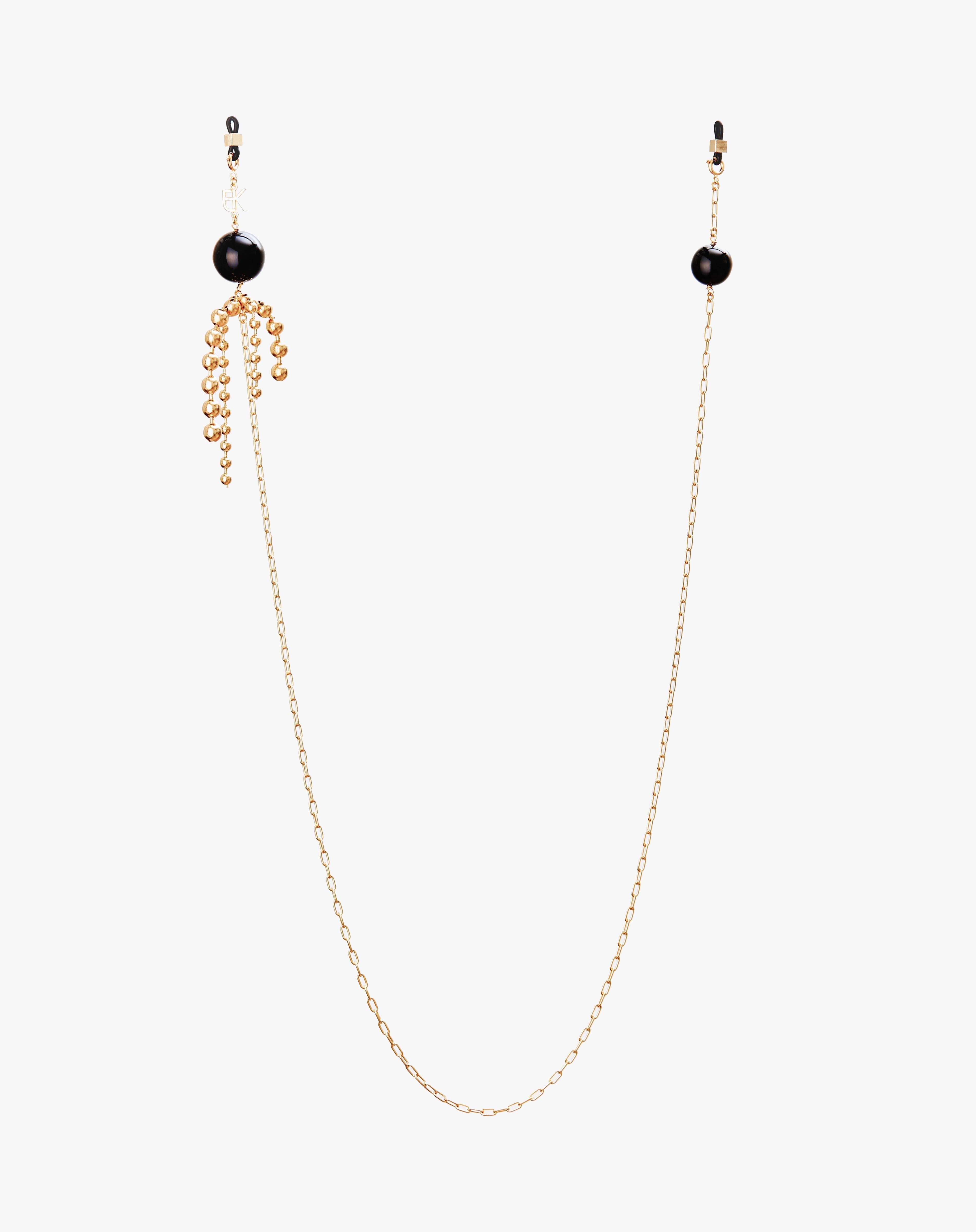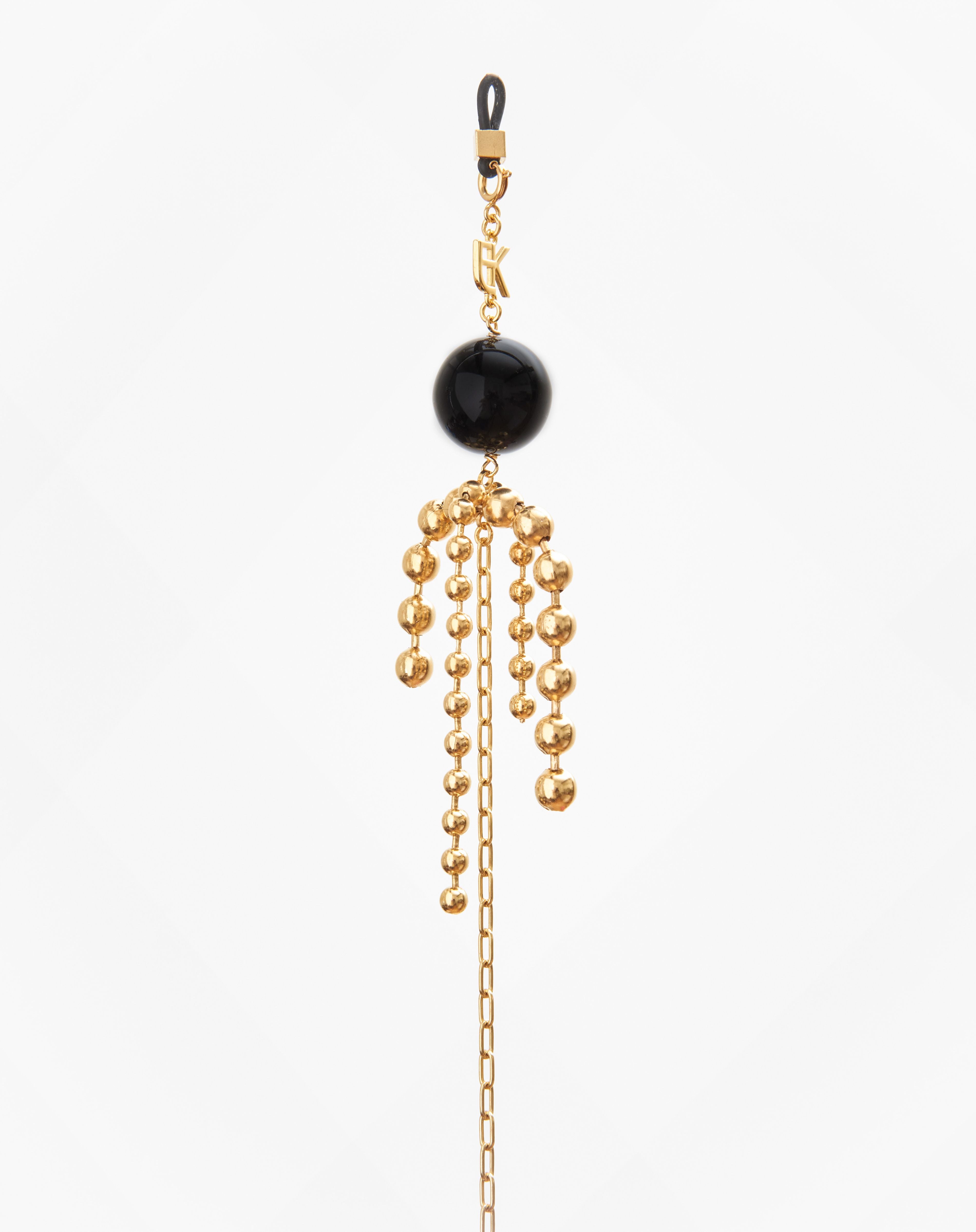 Emmanuelle Khanh imagines an original accesorie mixing a gold plated chain and round beads. Adorned like earrings, this accessory continues to explore a jewel dimension. Chain length: 75cm. Designed and handcrafted in France.