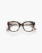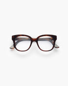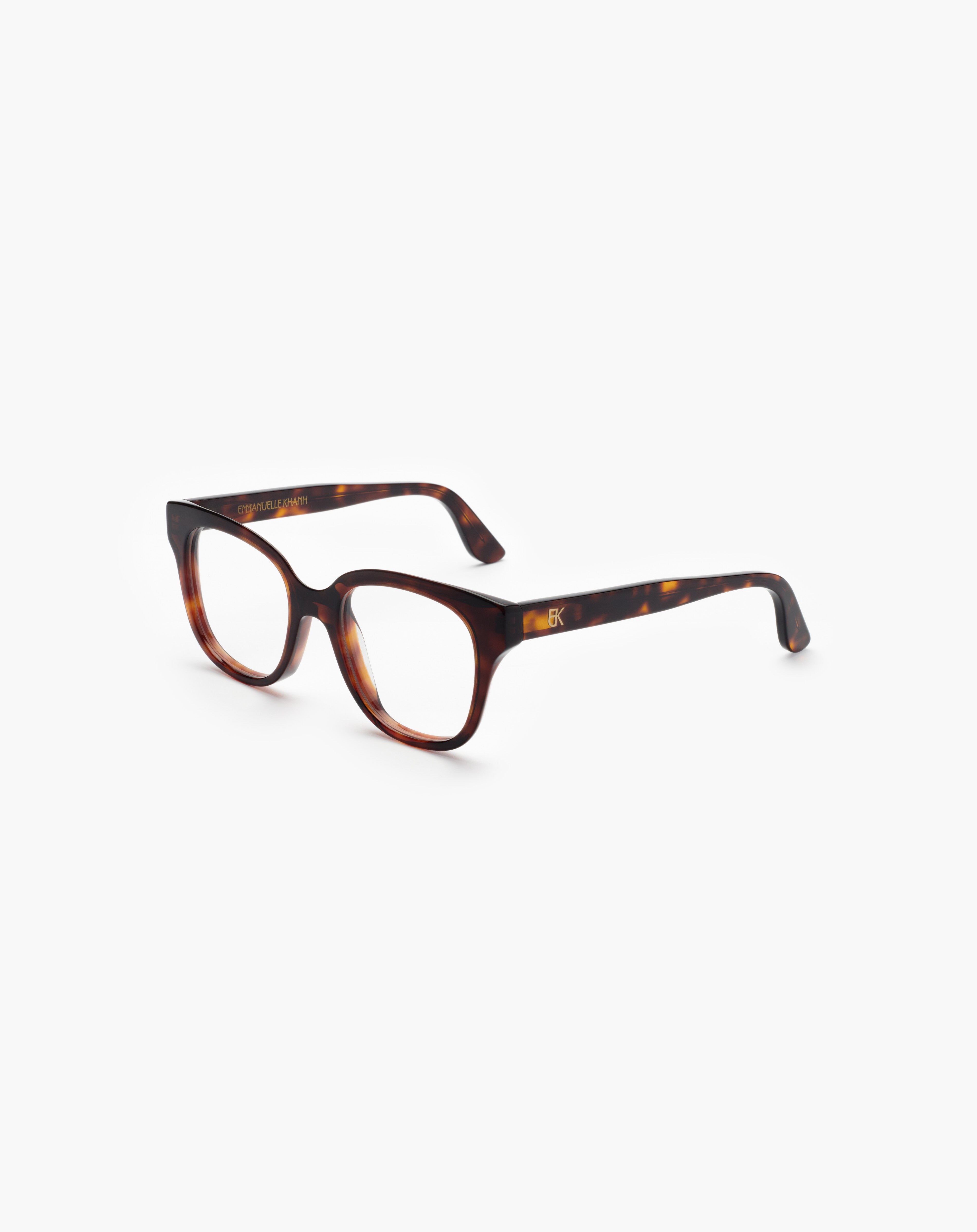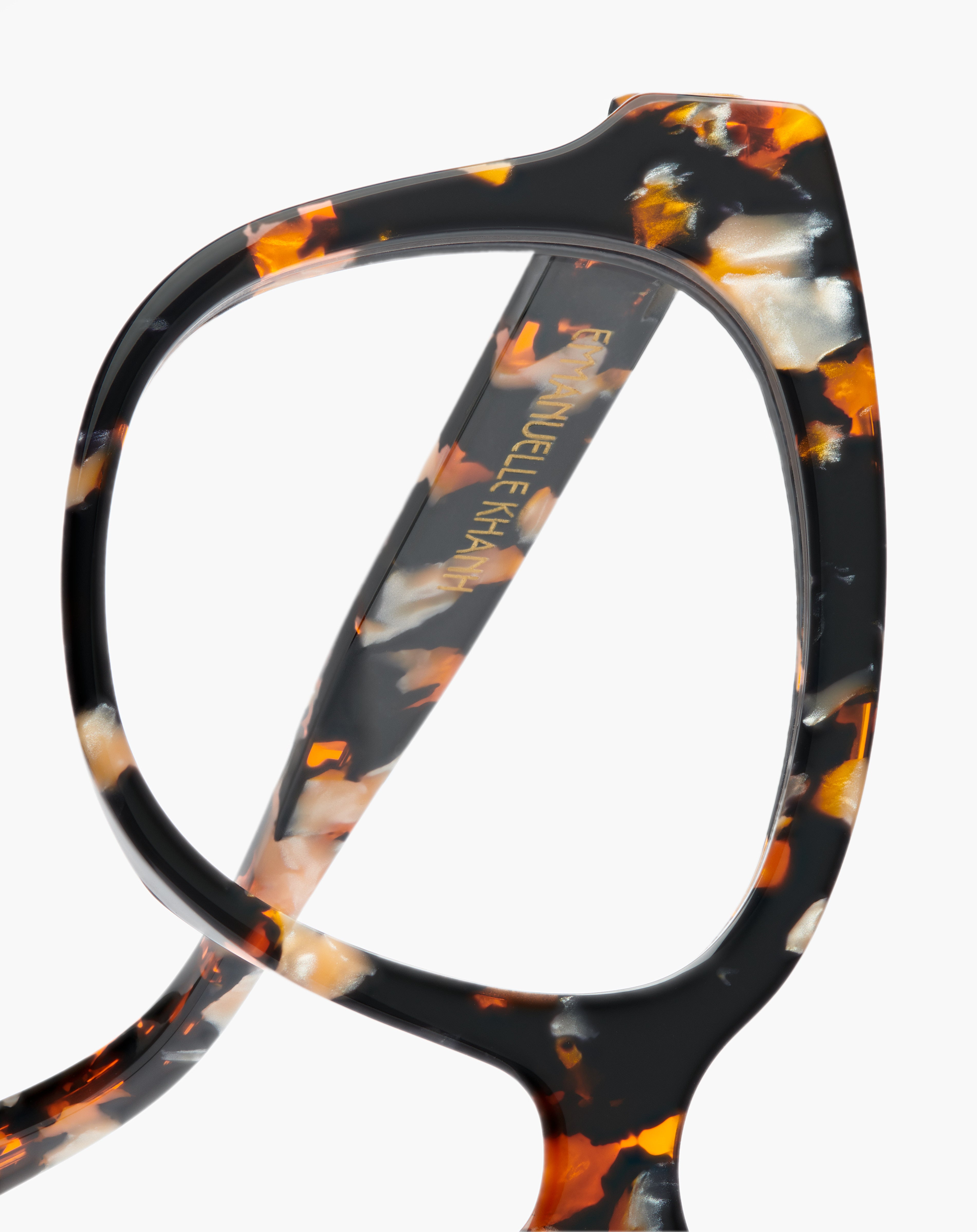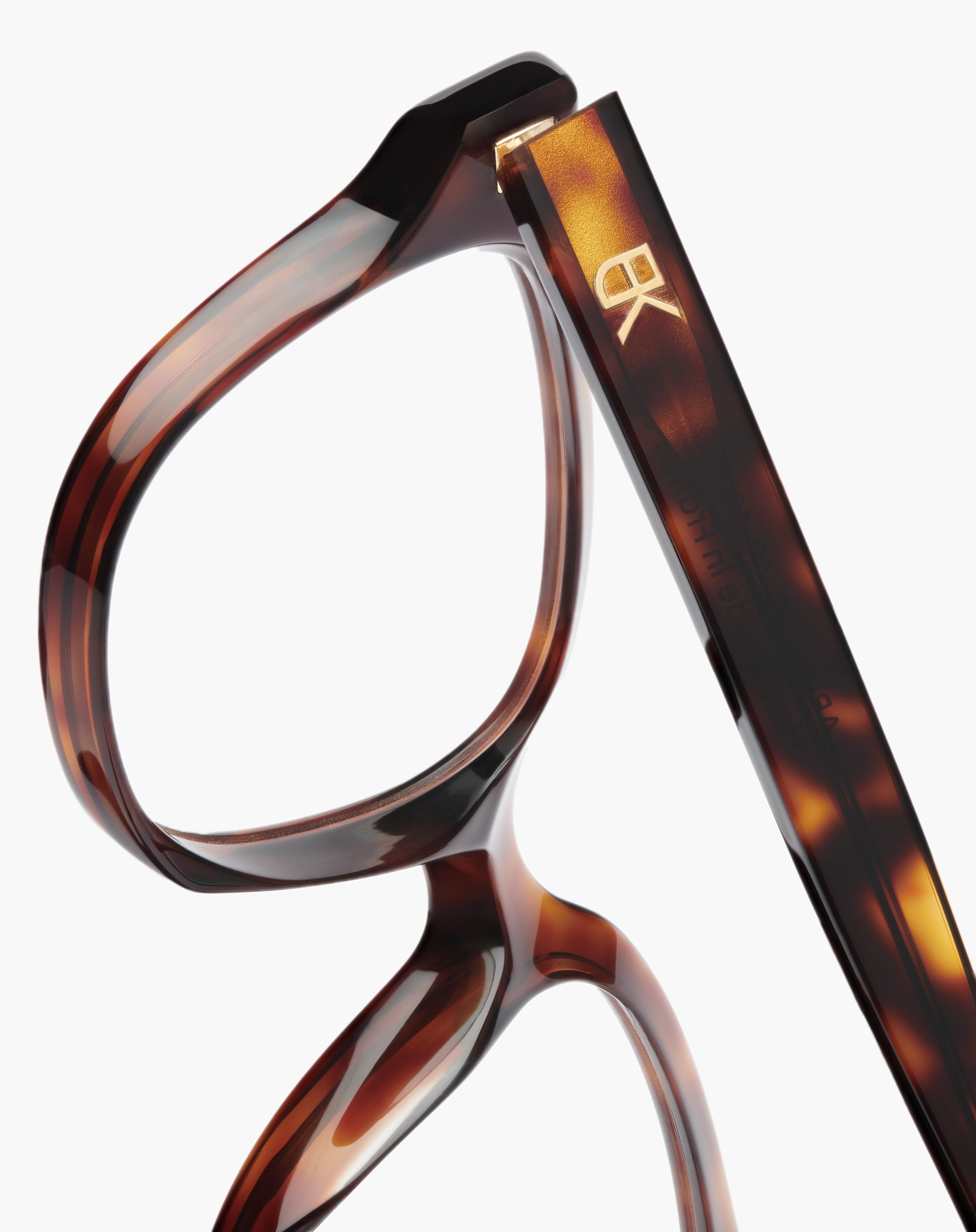 The optical April is a frame in acetate, handcrafted in France. The marked bevel work displays a design that is both audacious and timeless. Its temples are adorned by a gold metallic monogram placed under resin, as an elegant and emblematic signature touch.