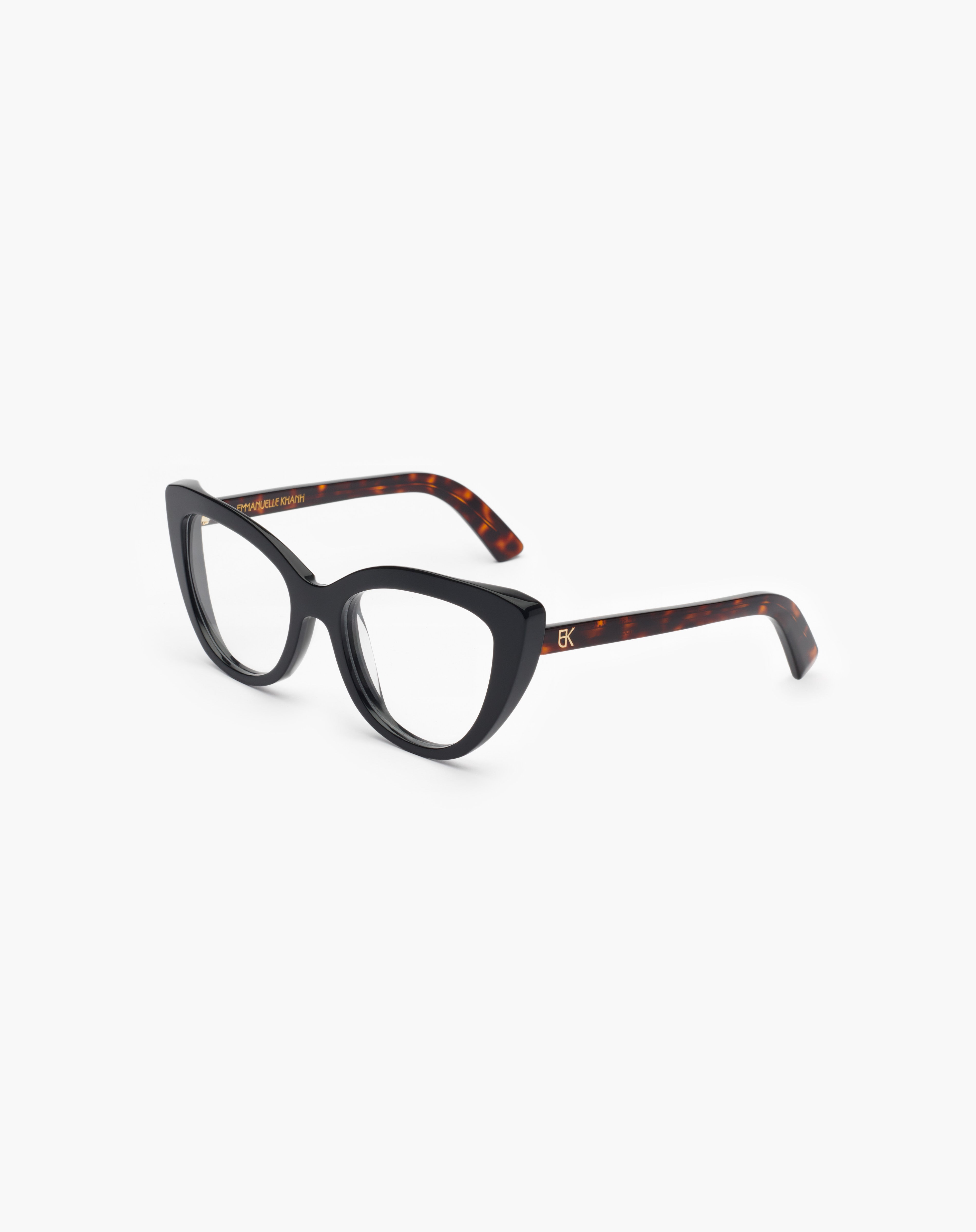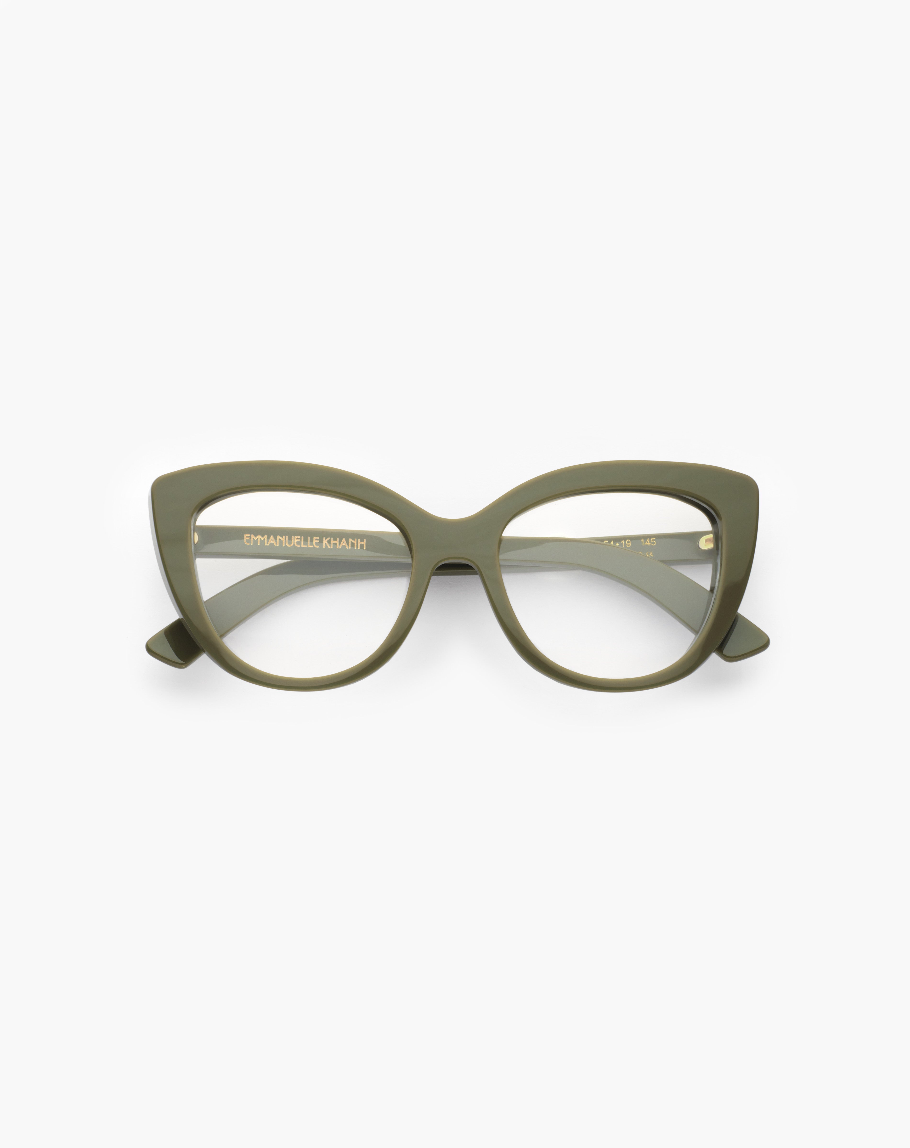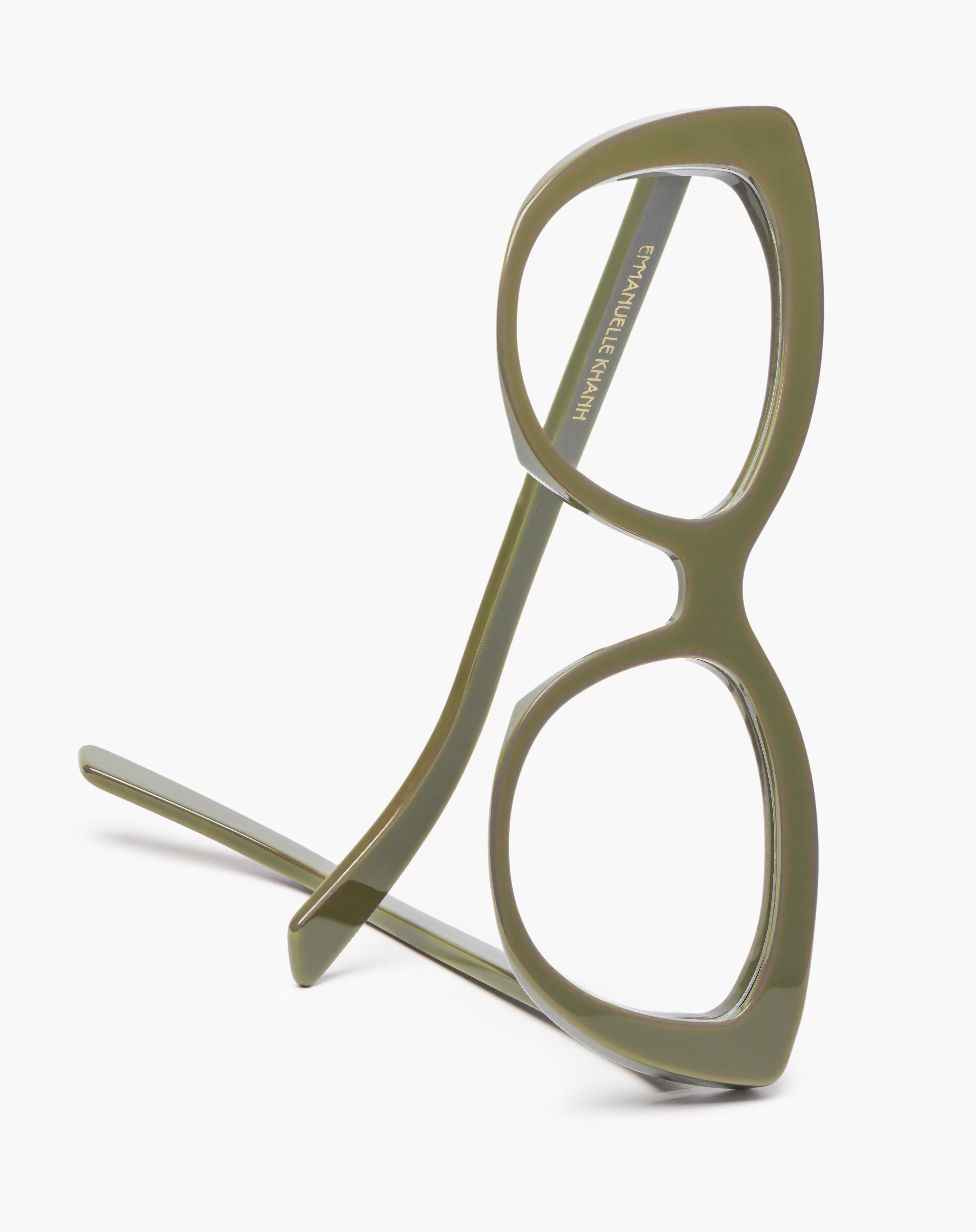 The Domo eyeglasses are crafted from acetate and handmade in France. Featuring bold beveling, the design makes a striking statement. The temples are adorned with a gold metal monogram set beneath resin, offering an elegant and iconic signature touch.