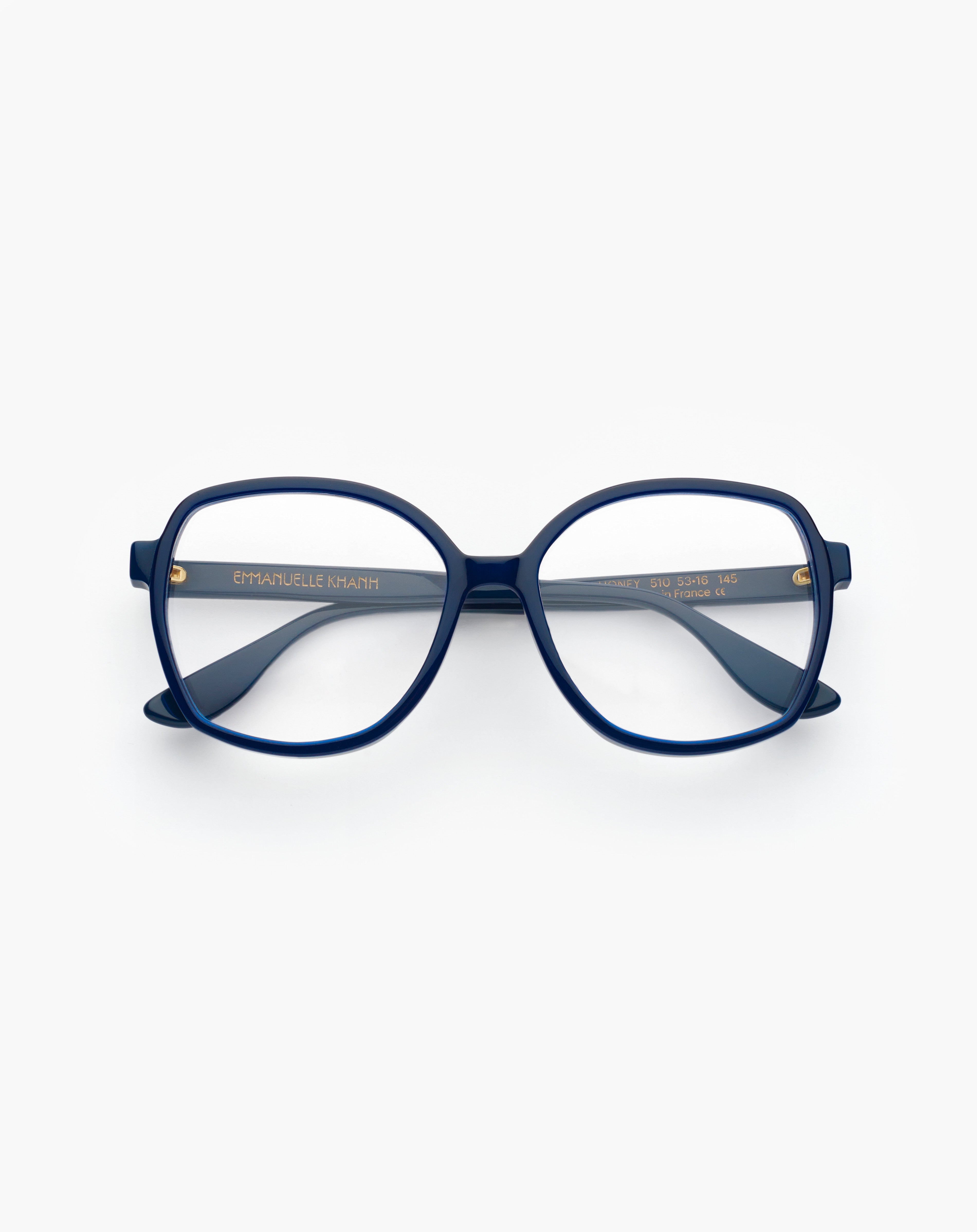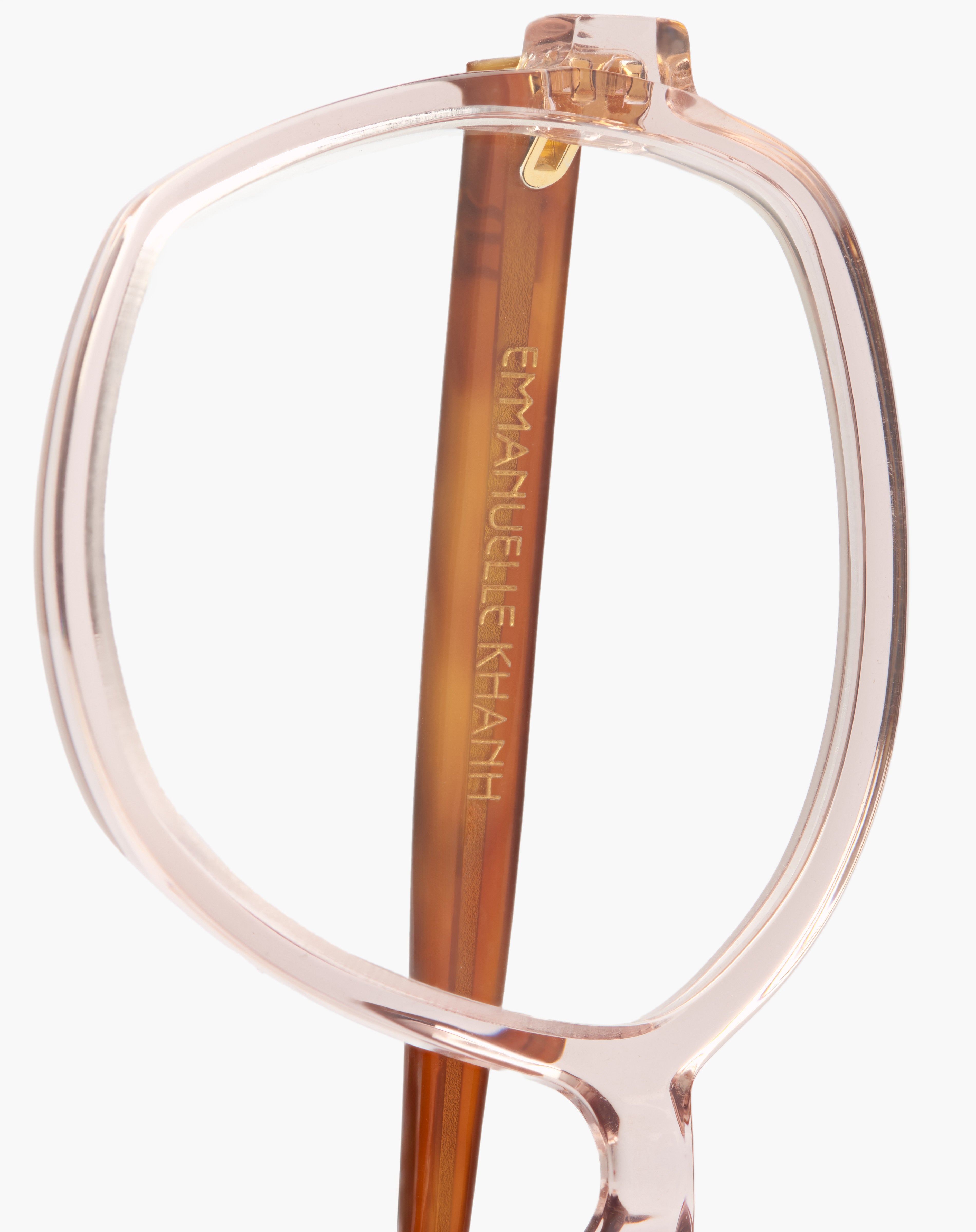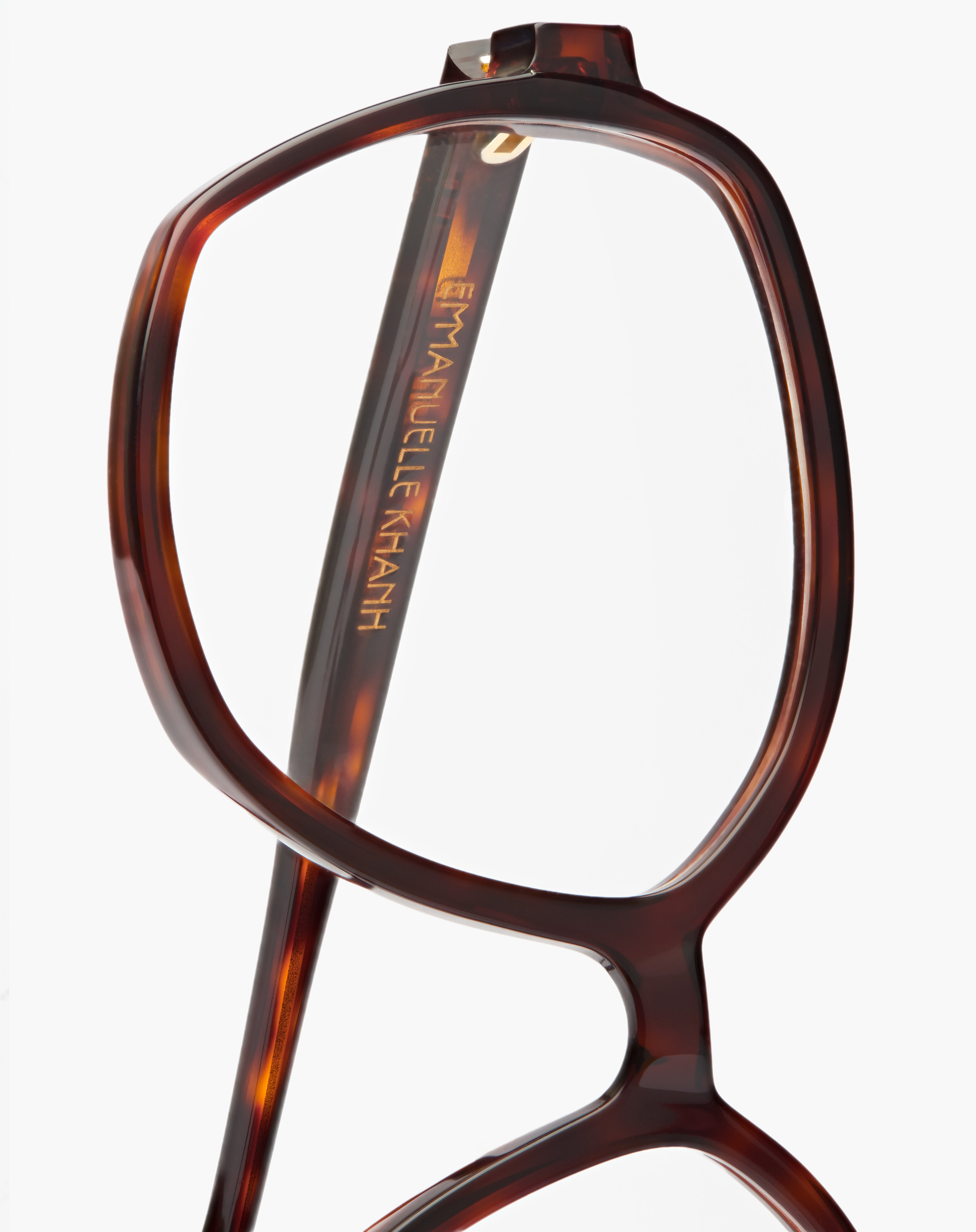 The Honey eyeglasses are crafted from acetate and handmade in France. Featuring bold beveling, the design makes a striking statement. The temples are adorned with a gold metal monogram set beneath resin, offering an elegant and iconic signature touch.
