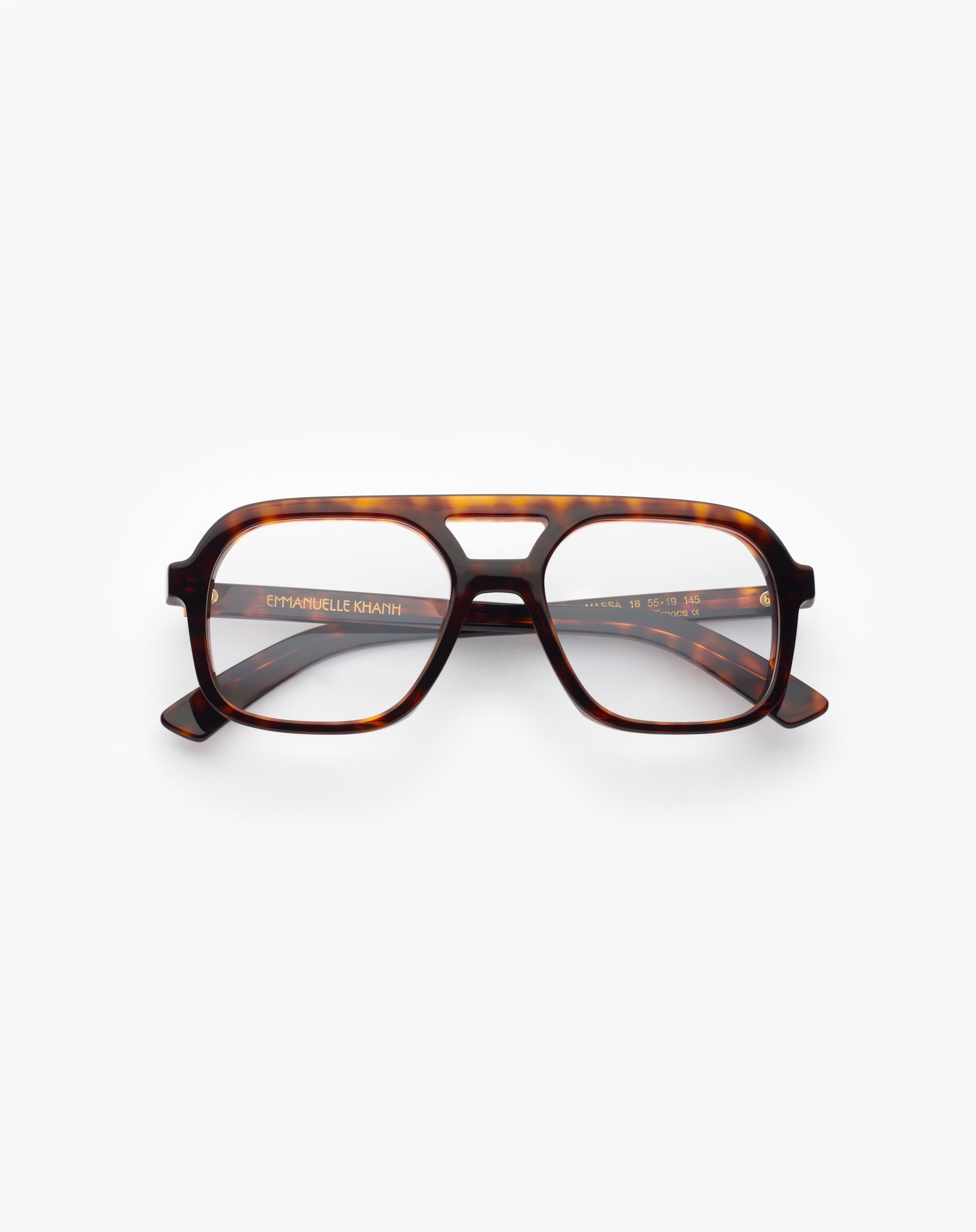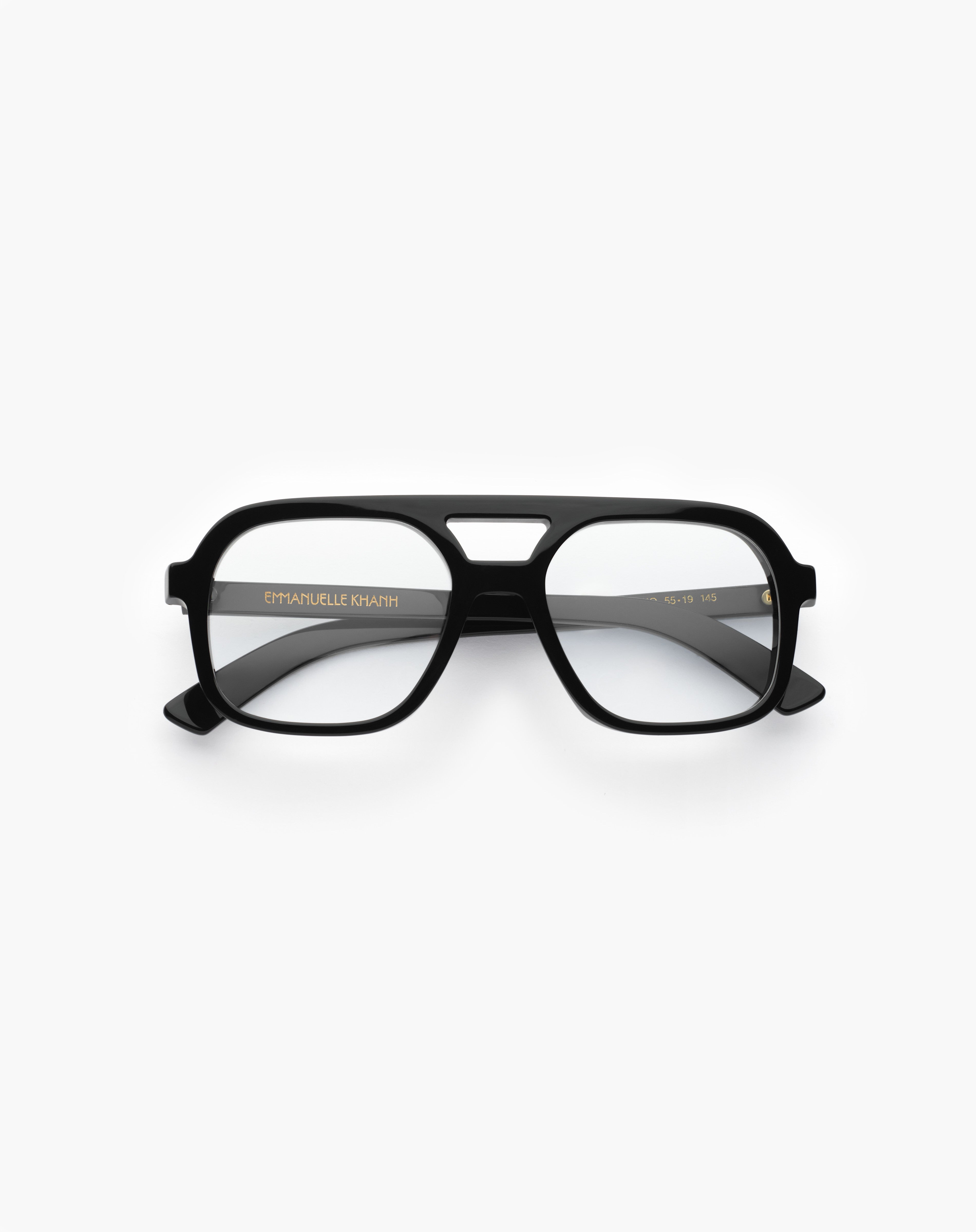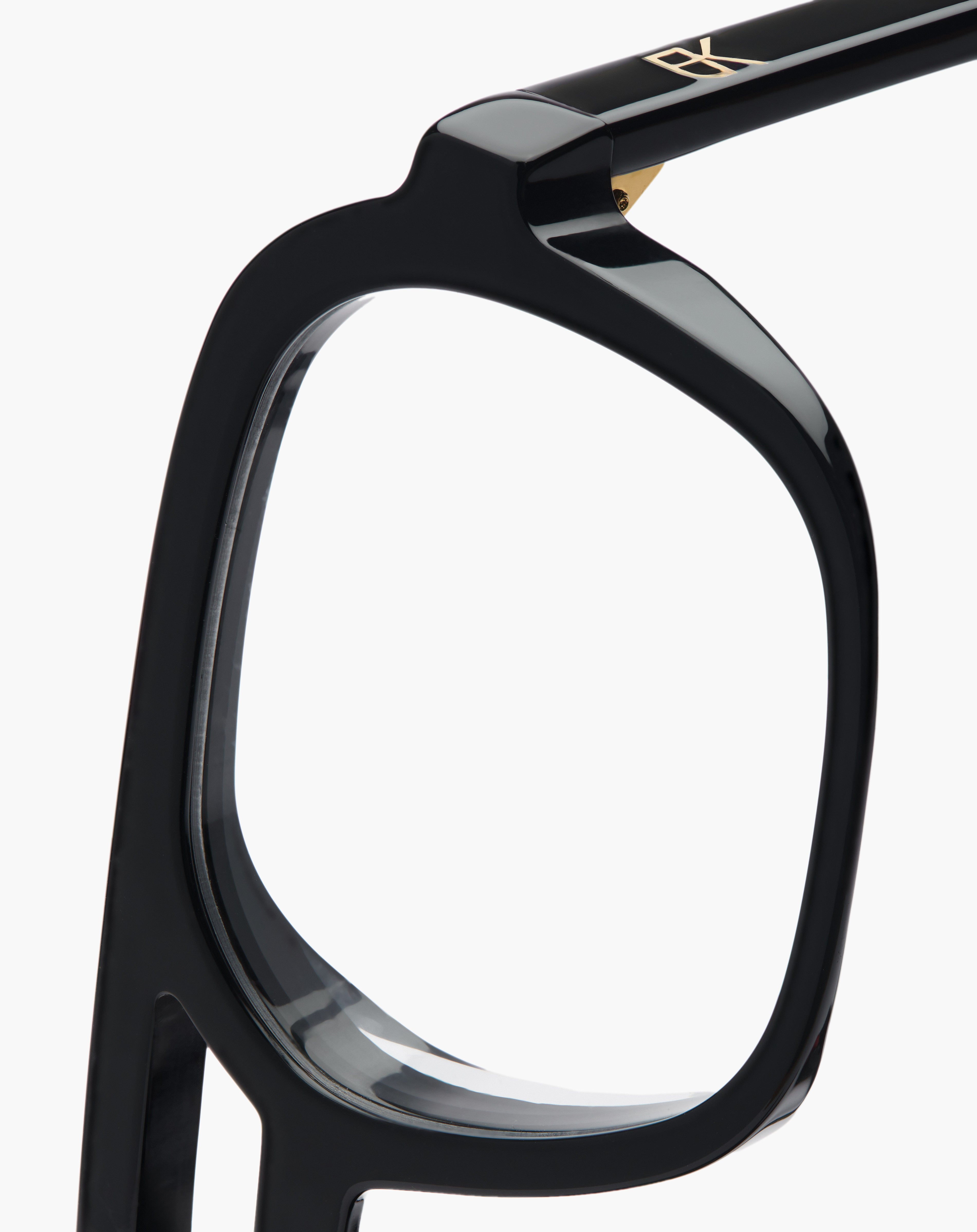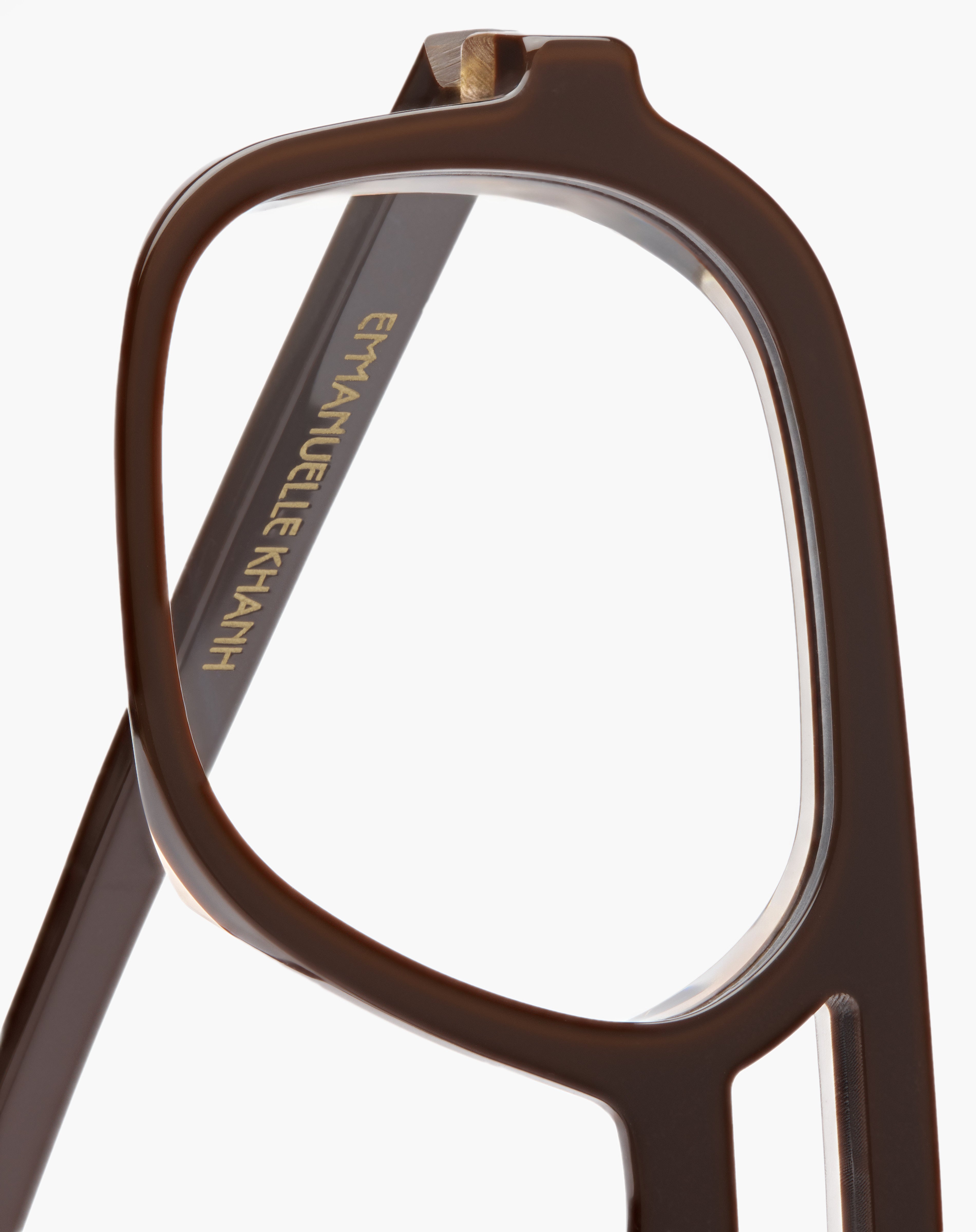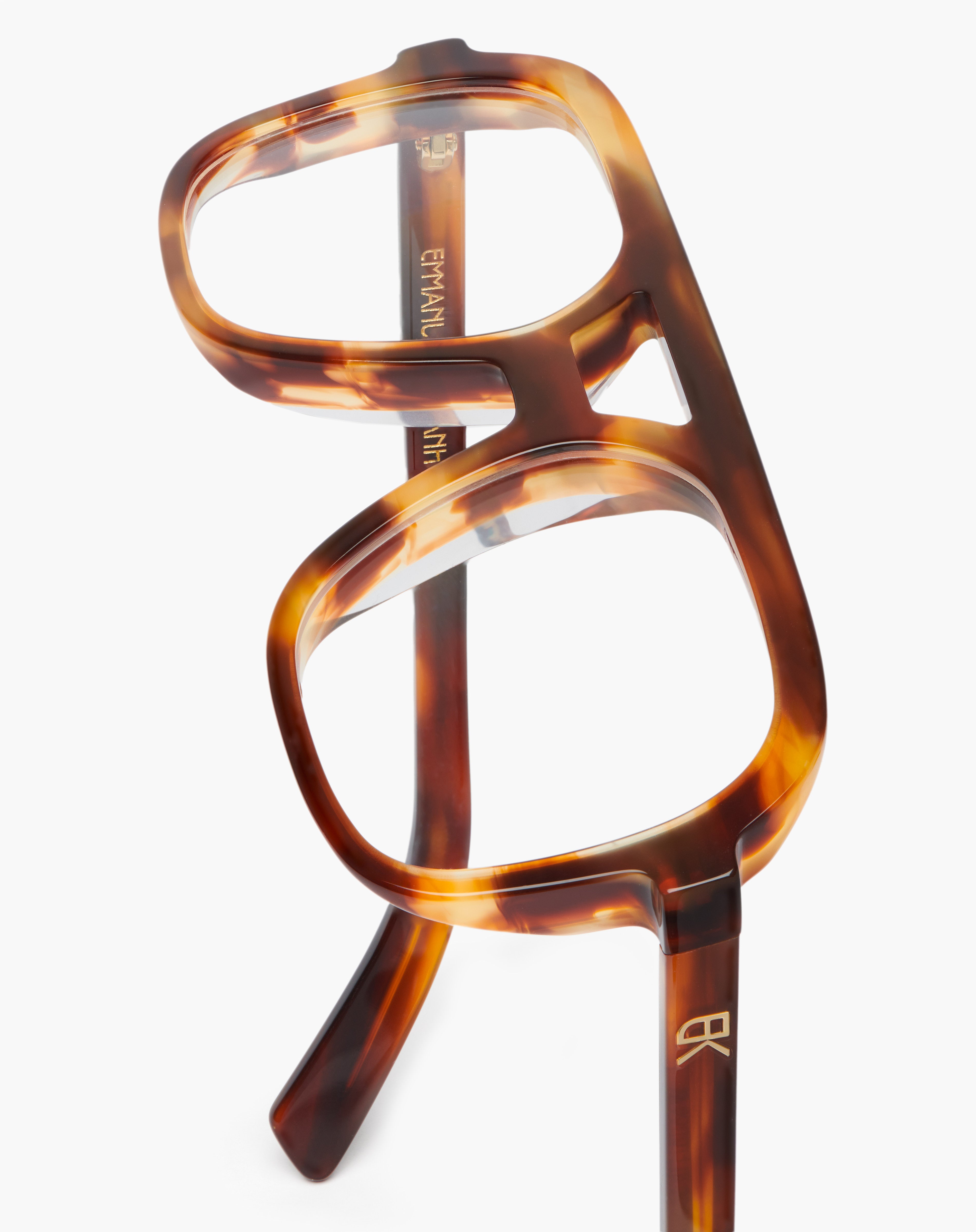 The Massa eyeglasses are crafted from acetate and handmade in France. Featuring bold beveling, the design makes a striking statement. The temples are adorned with a gold metal monogram set beneath resin, offering an elegant and iconic signature touch.
