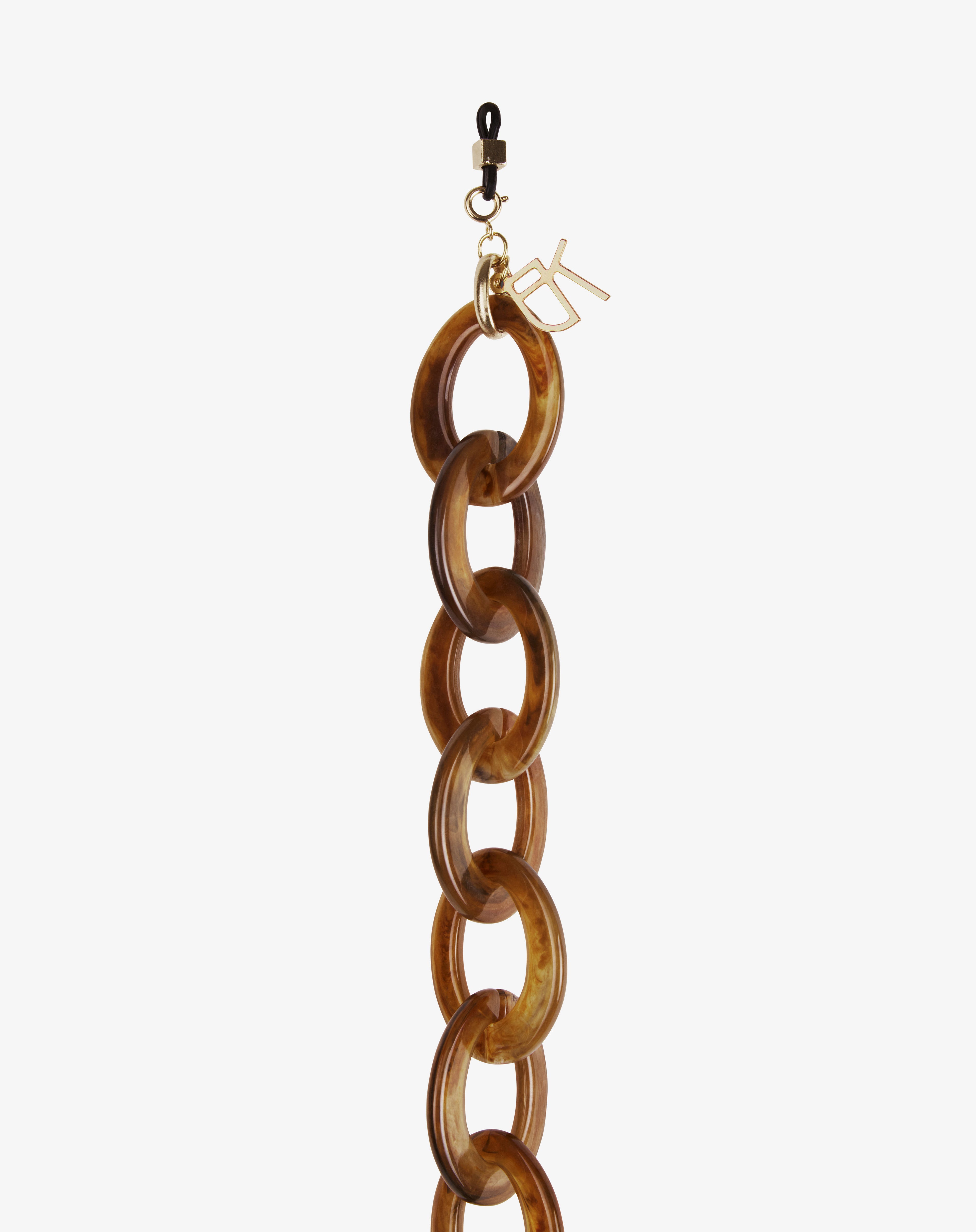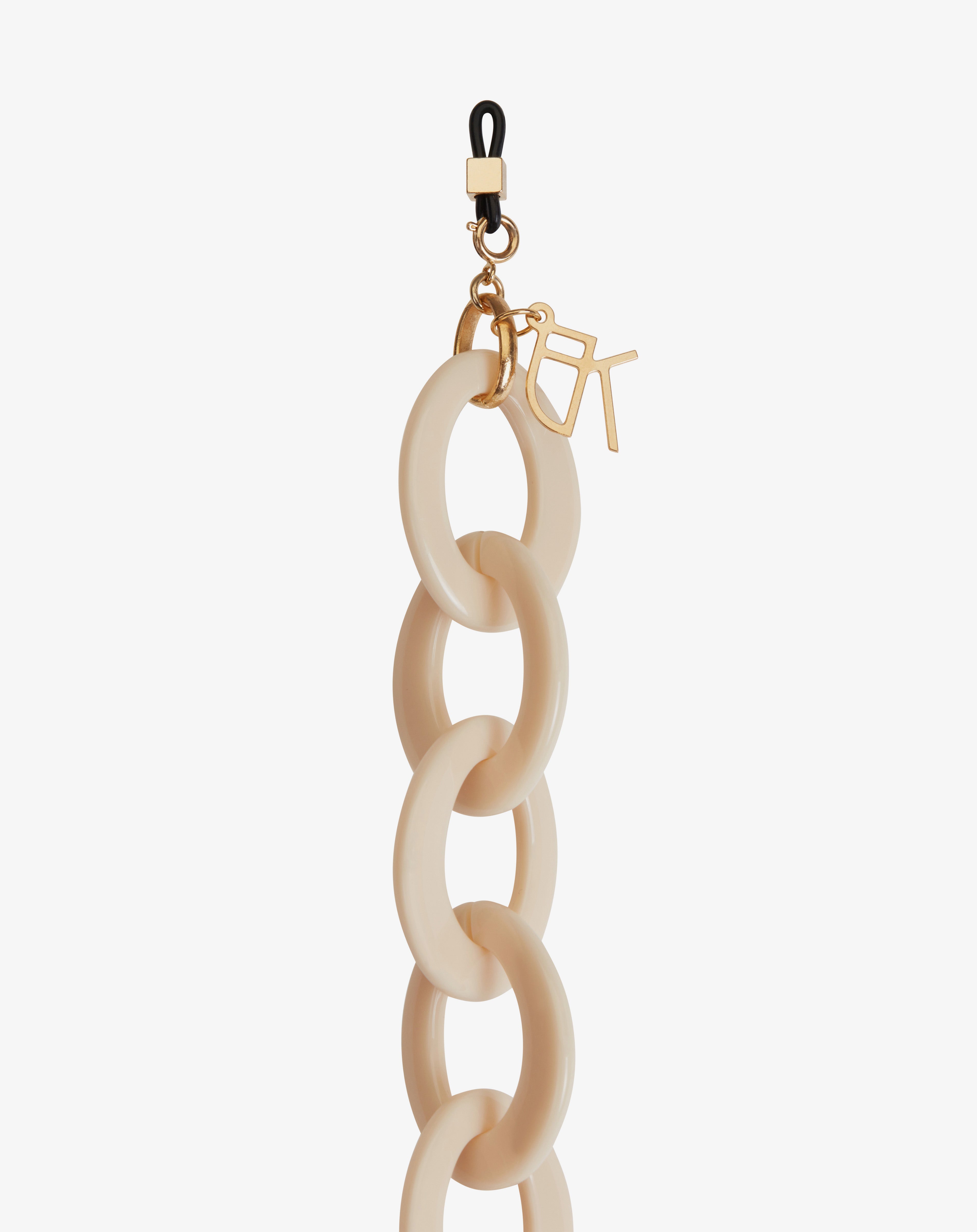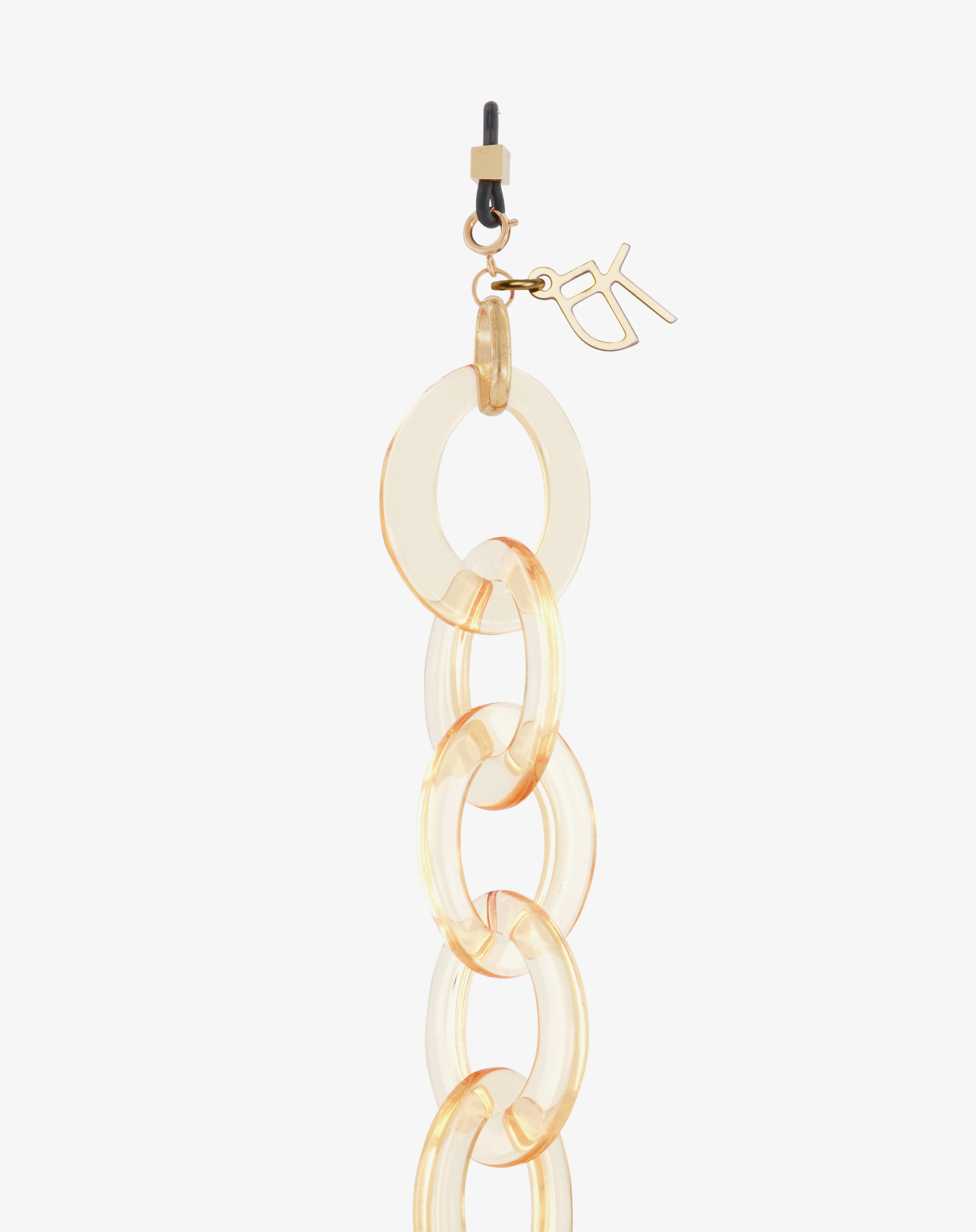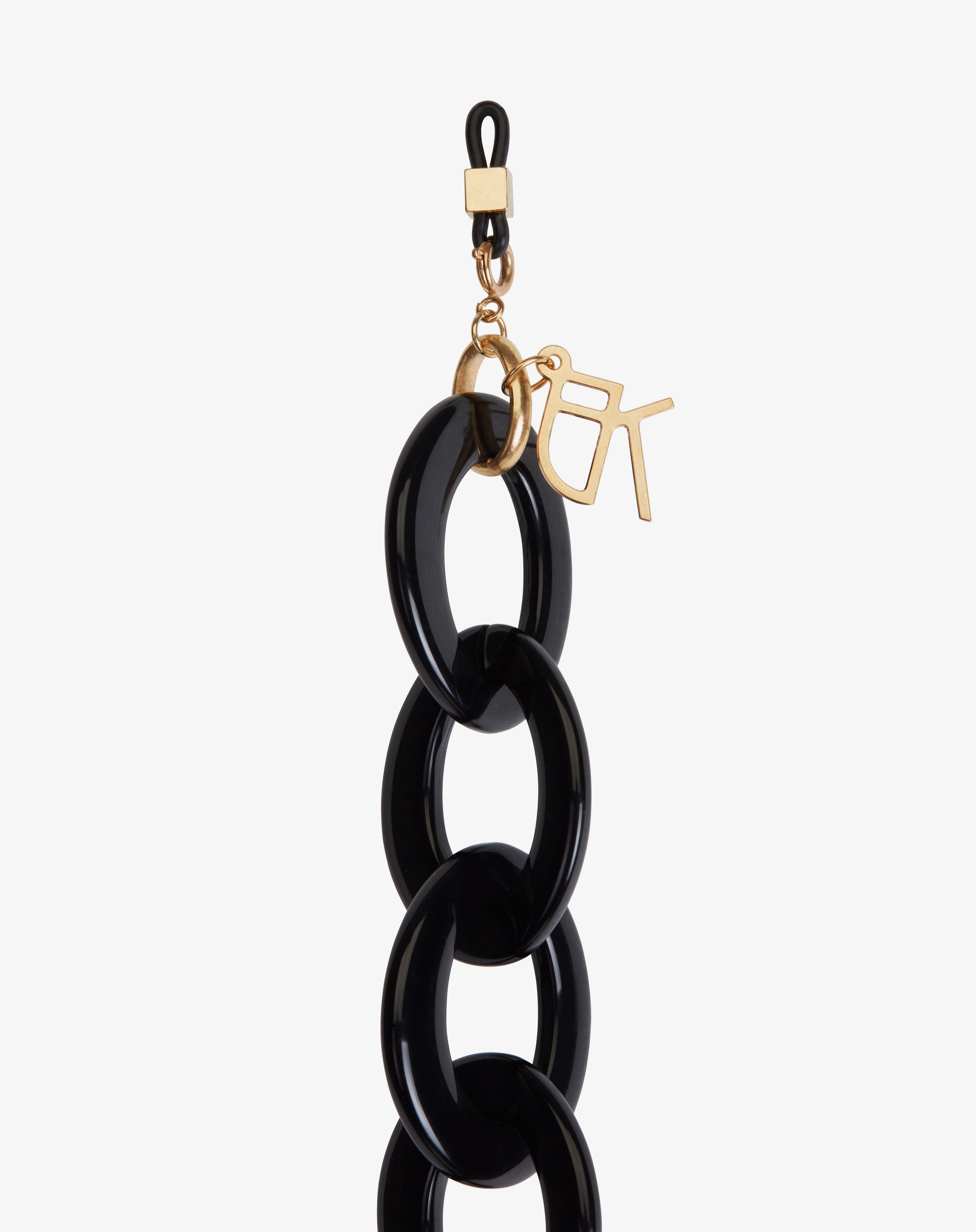 Emmanuelle Khanh imagine une chaînette inédite et généreuse. Une chaînette précieuse, aux couleurs intemporelles et pleines. L'Ovale allie les volumes de l'acrylique à la finesse du laiton doré à l'or fin. Décorée du logo iconique de la Maison, elle crée immédiatement un look fort, mode, audacieux. Longueur de la chaînette : 95 cm. Dessinée en France et fabriquée main en Italie.