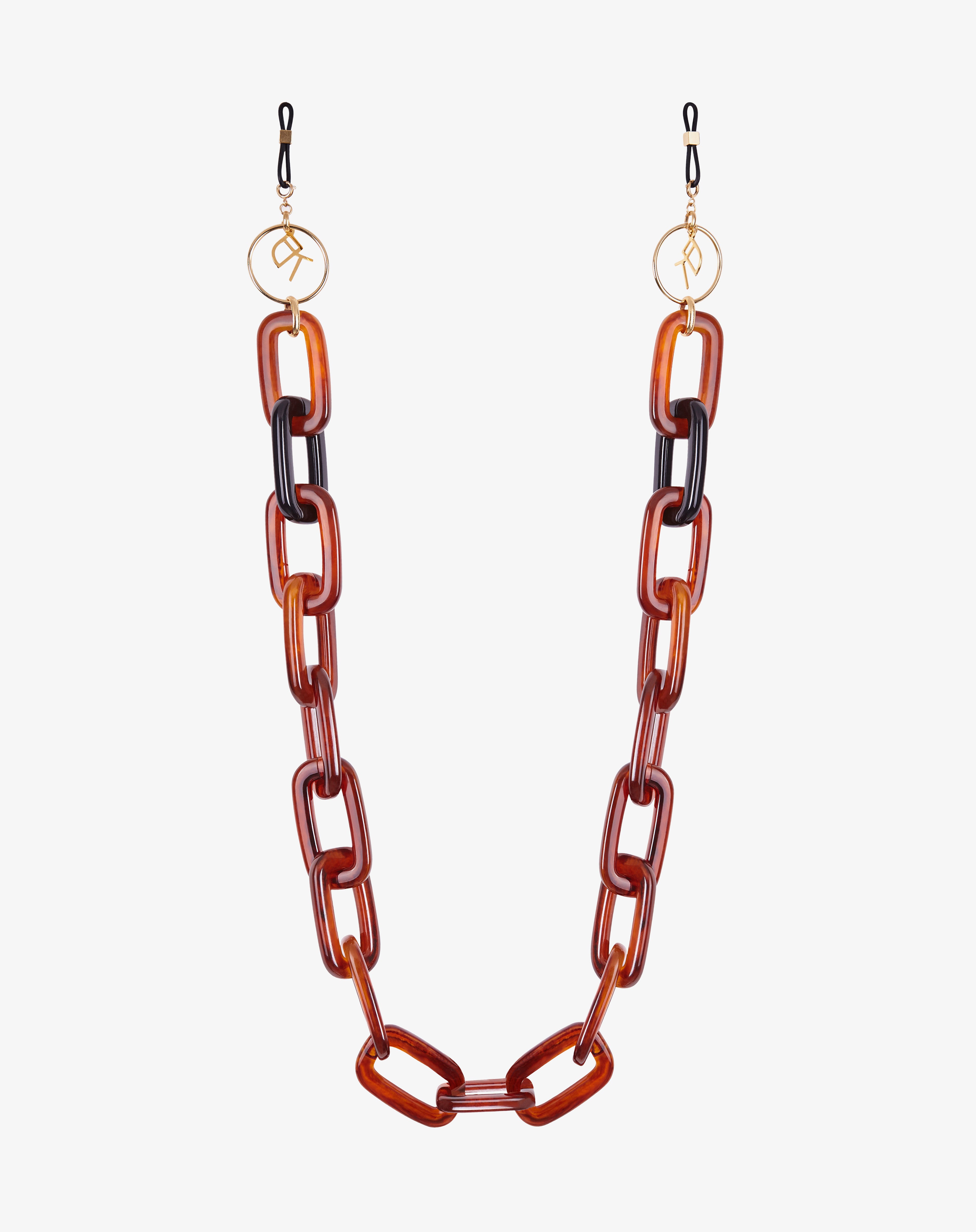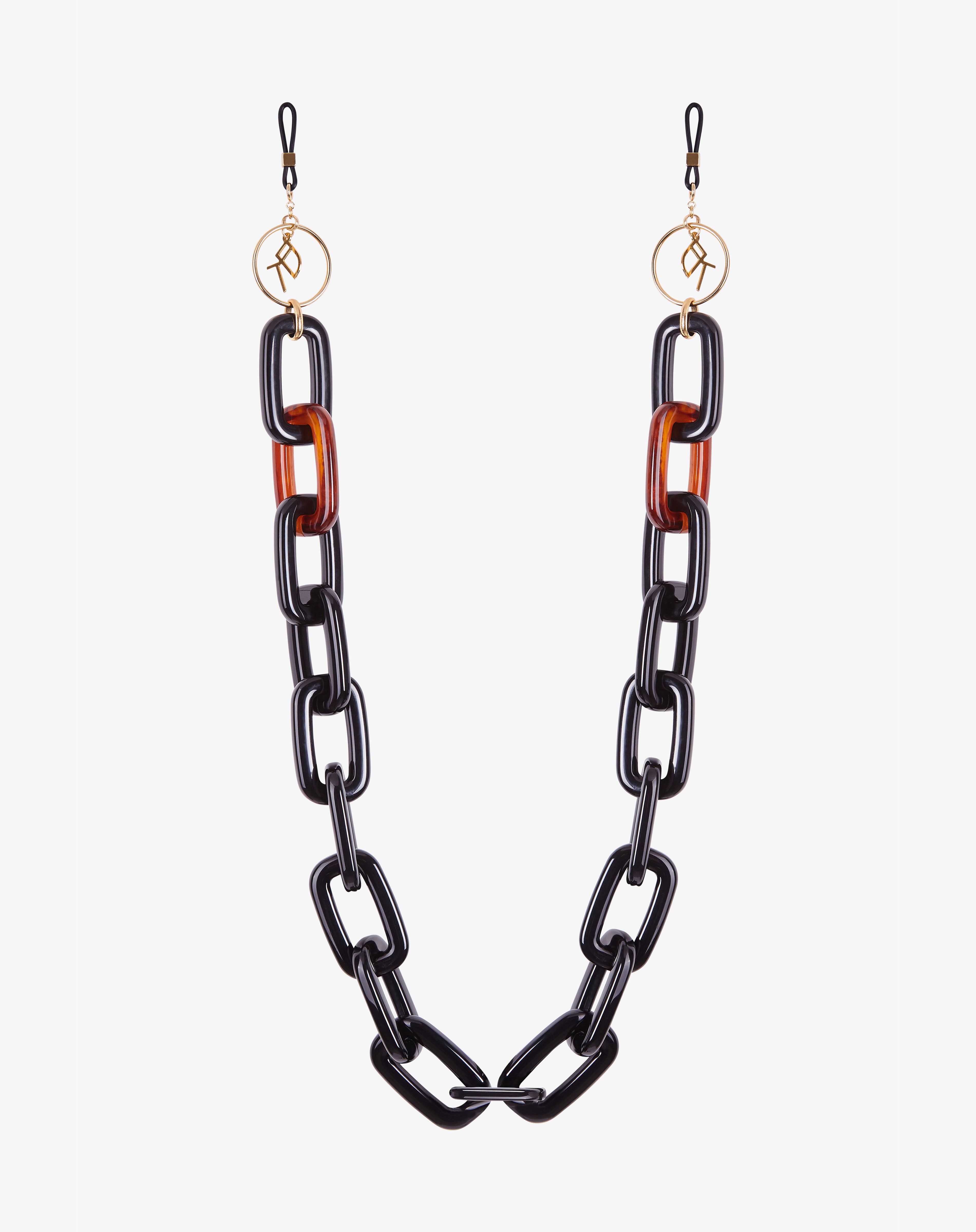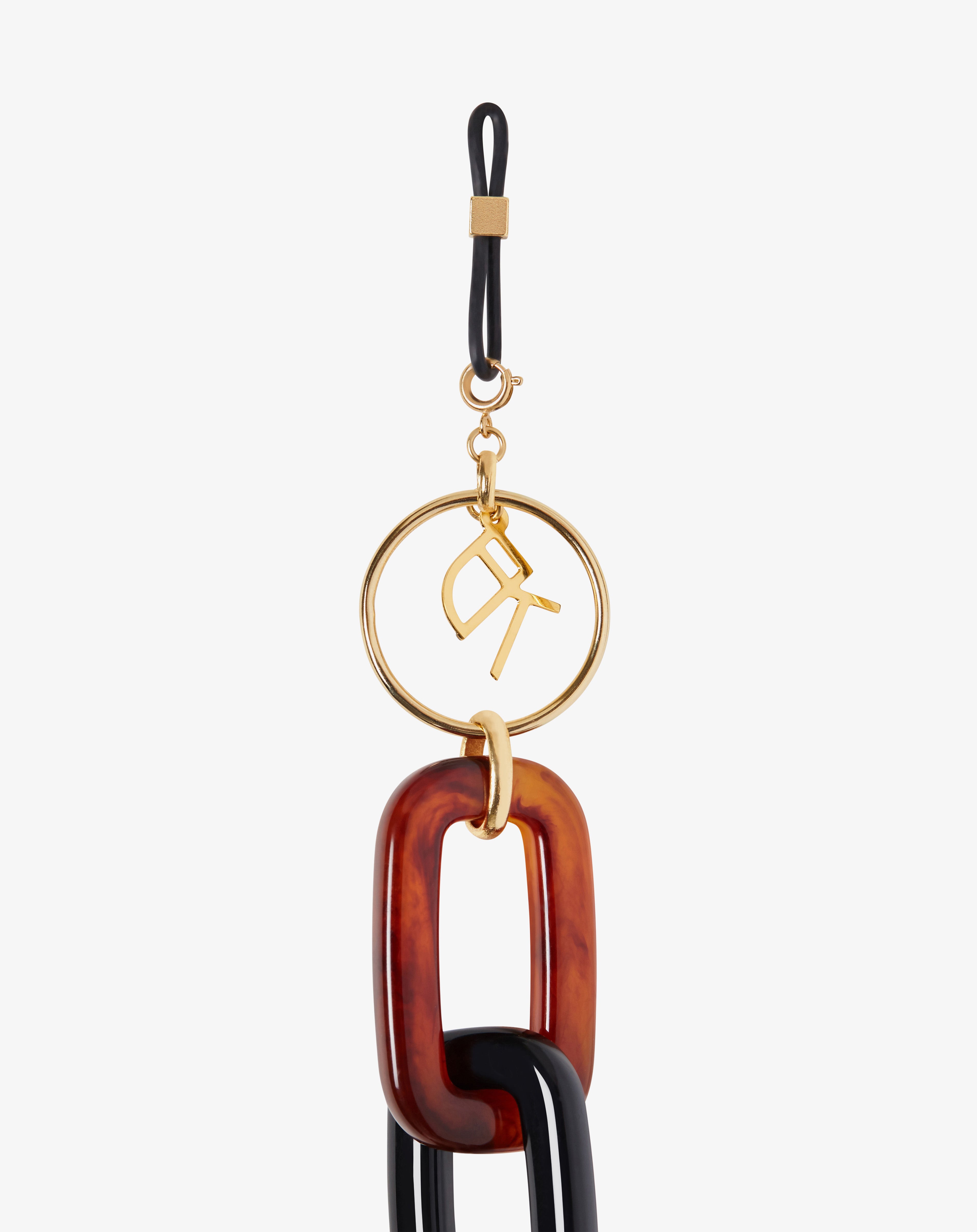 La plus oversize des chaînettes Emmanuelle Khanh allie des anneaux en acrylique généreux à la finesse du laiton doré à l'or fin. Décorée des logos de la Maison, elle crée immédiatement un look fort, mode, audacieux. Longueur de la chaînette : 80 cm Dessinée et fabriquée en France.