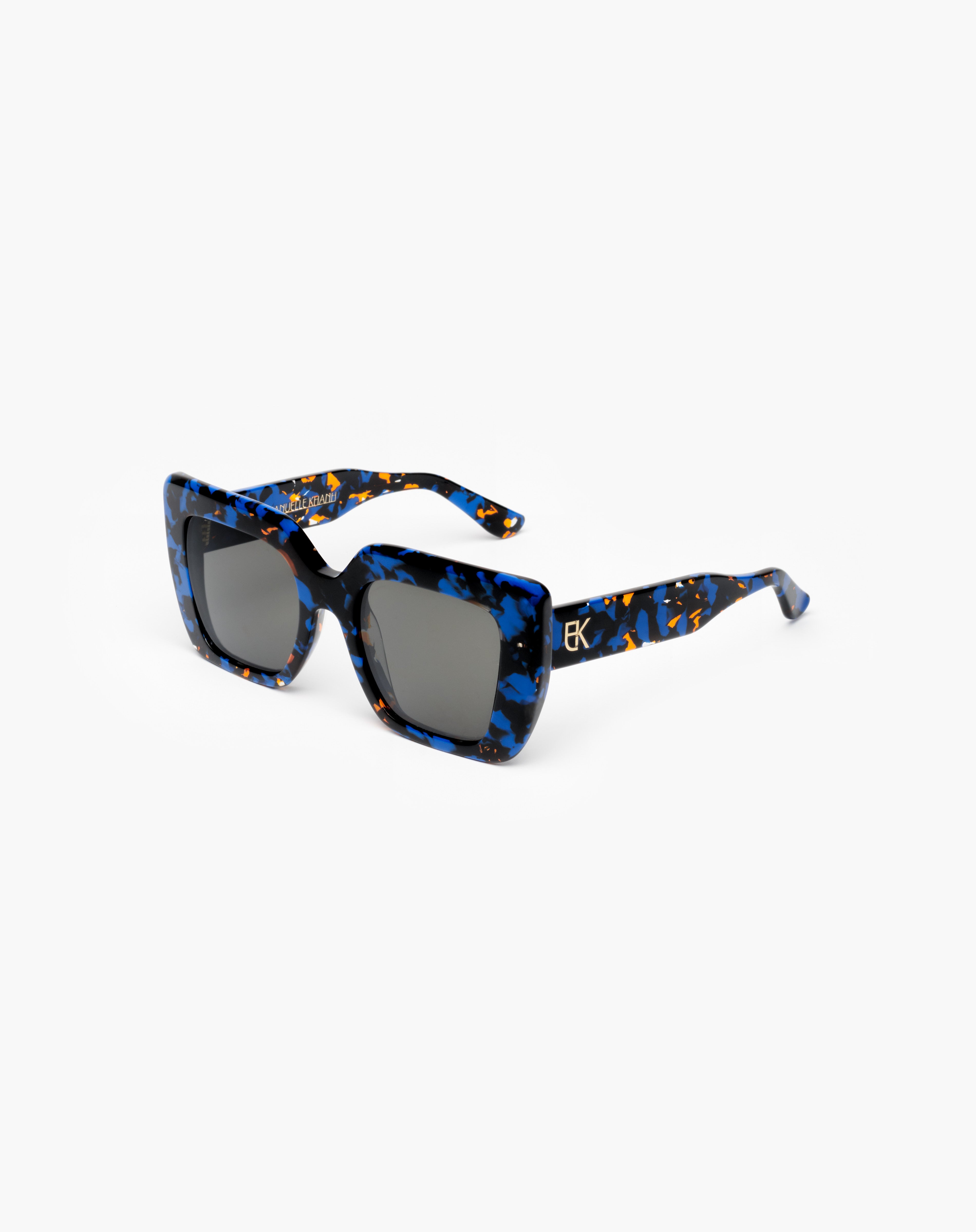 La solaire Foxy est une lunette carrée en acétate, fabriquée à la main en France. Le travail des biseaux intérieurs affiche un design audacieux. Ses branches sont ornées d'un monogramme en métal doré posé sous résine, pour une touche signature élégante et emblématique.