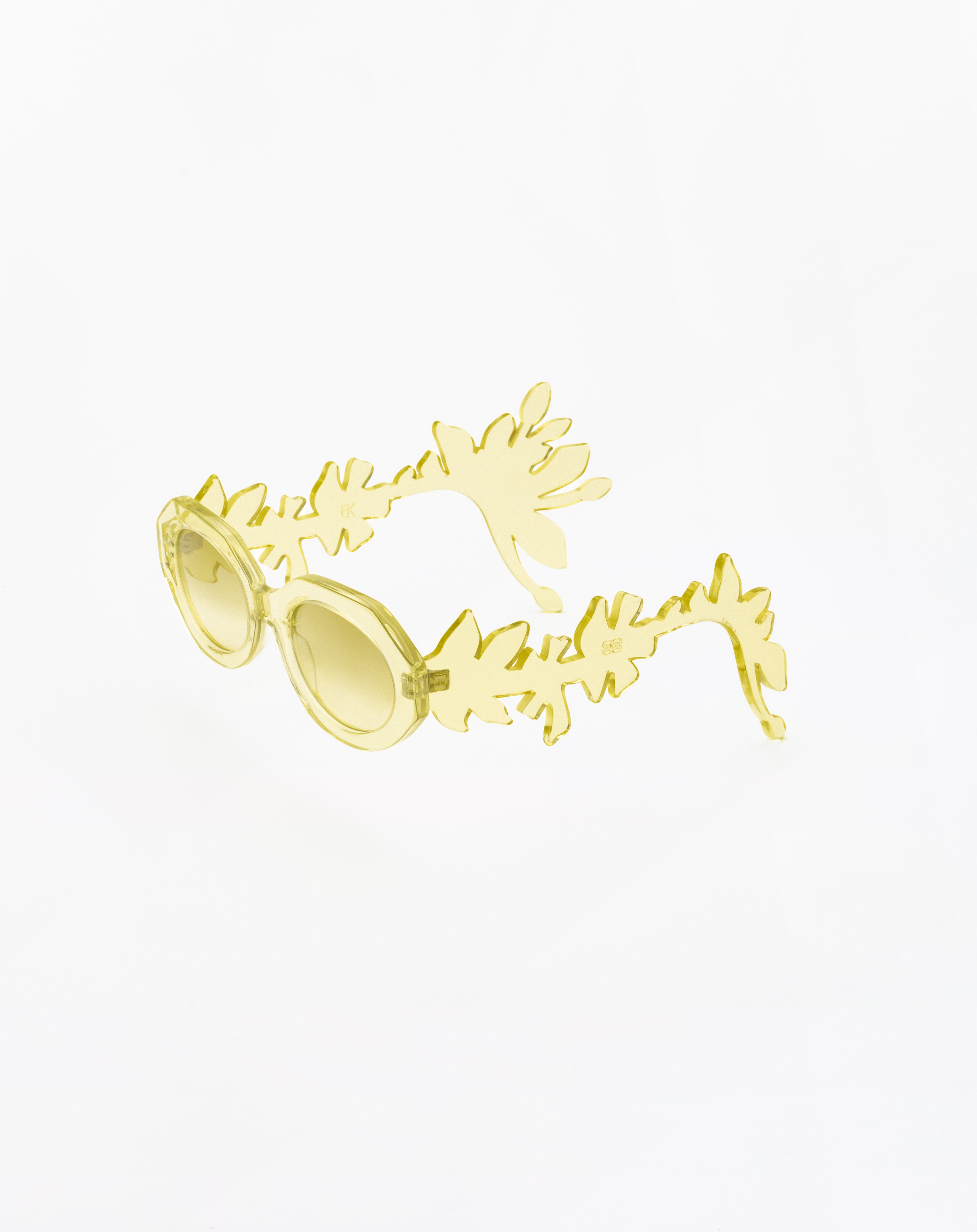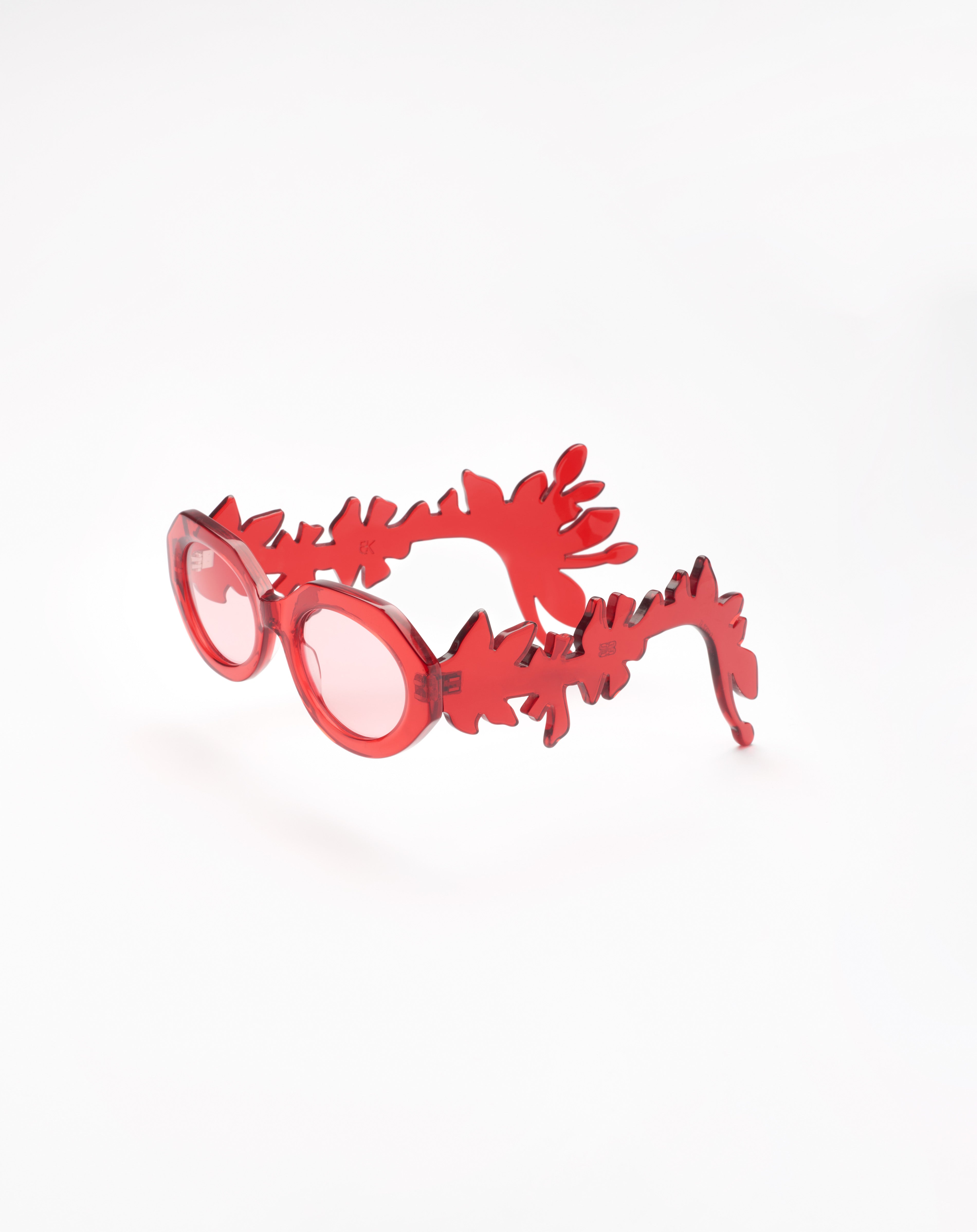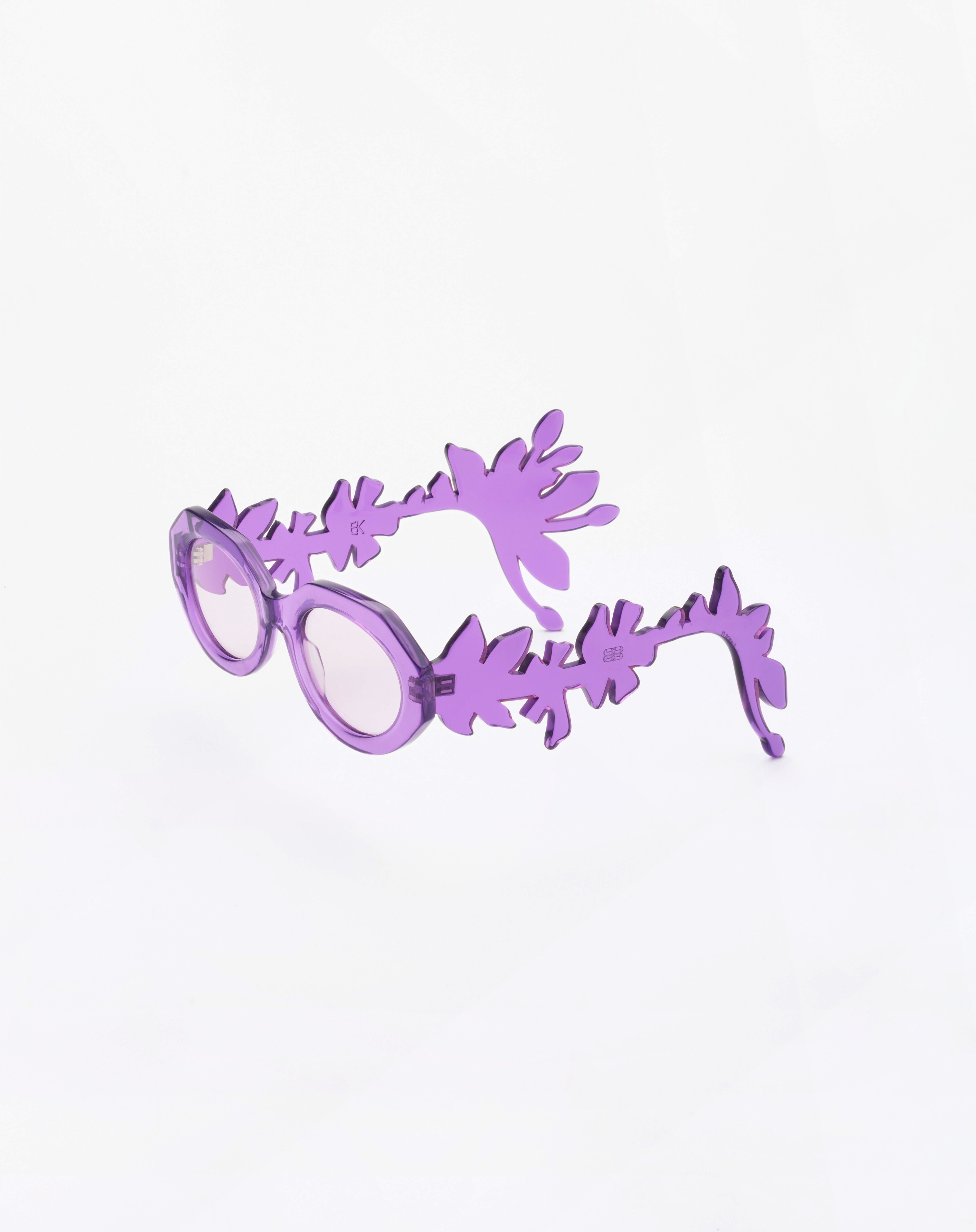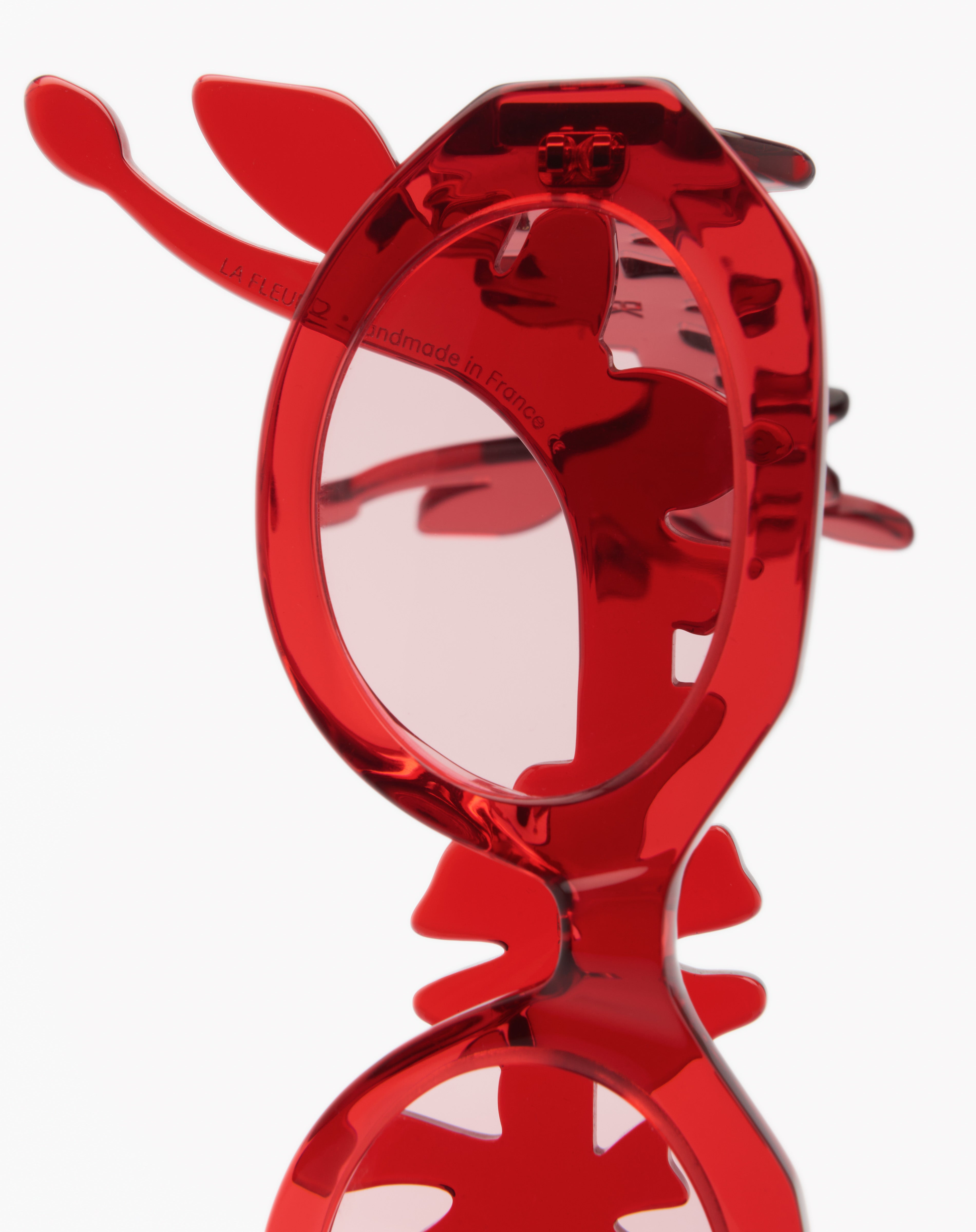 Monture en acétate ovale, fabriquée main en France d'un savoir-faire lunetier authentique. Collaboration Emmanuelle Khanh x Maitrepierre Branches Fleur asymétriques gravées des monogrammes des deux Maisons. Les acétates et les verres sont fabriqués en France ou en Italie, selon le coloris.