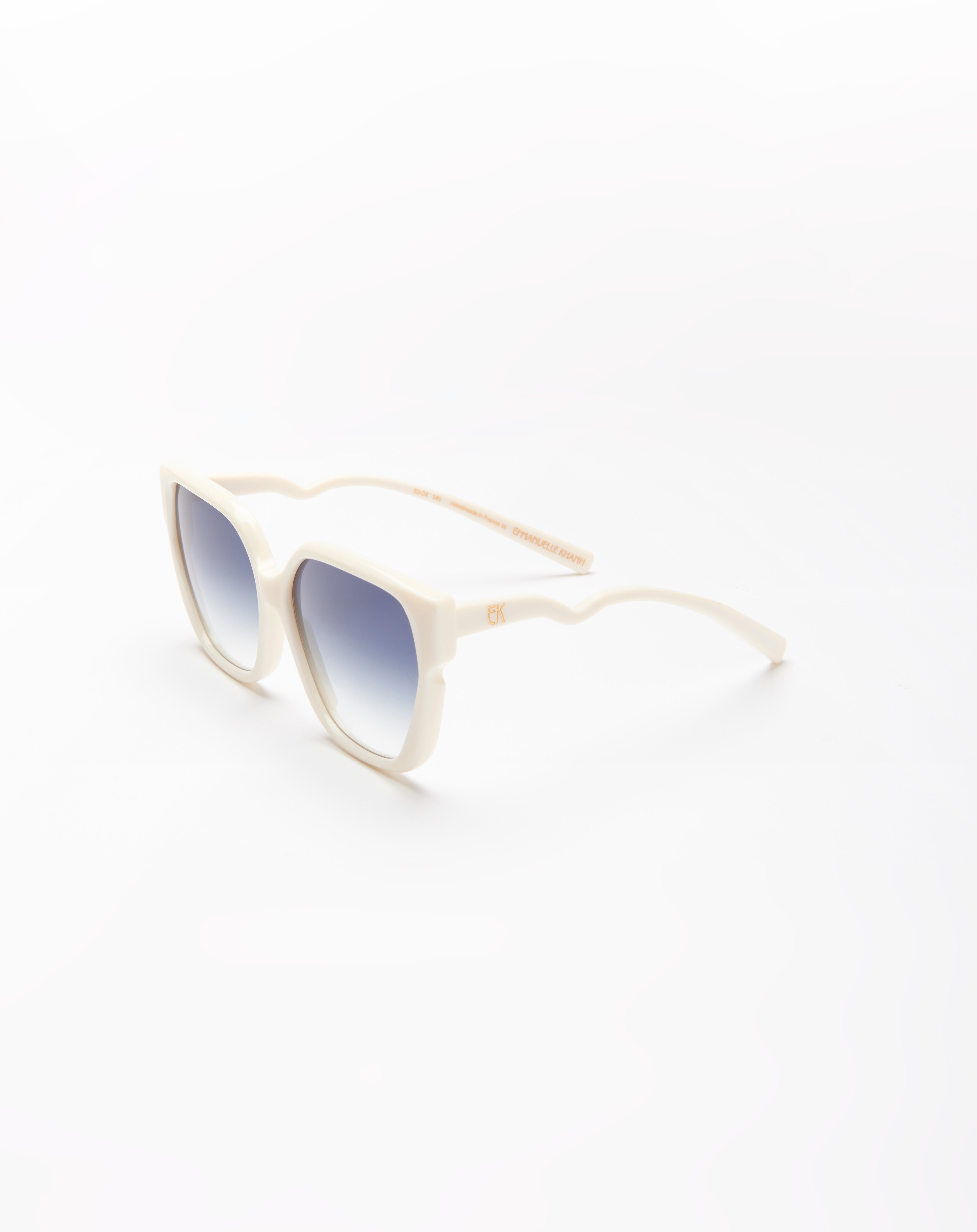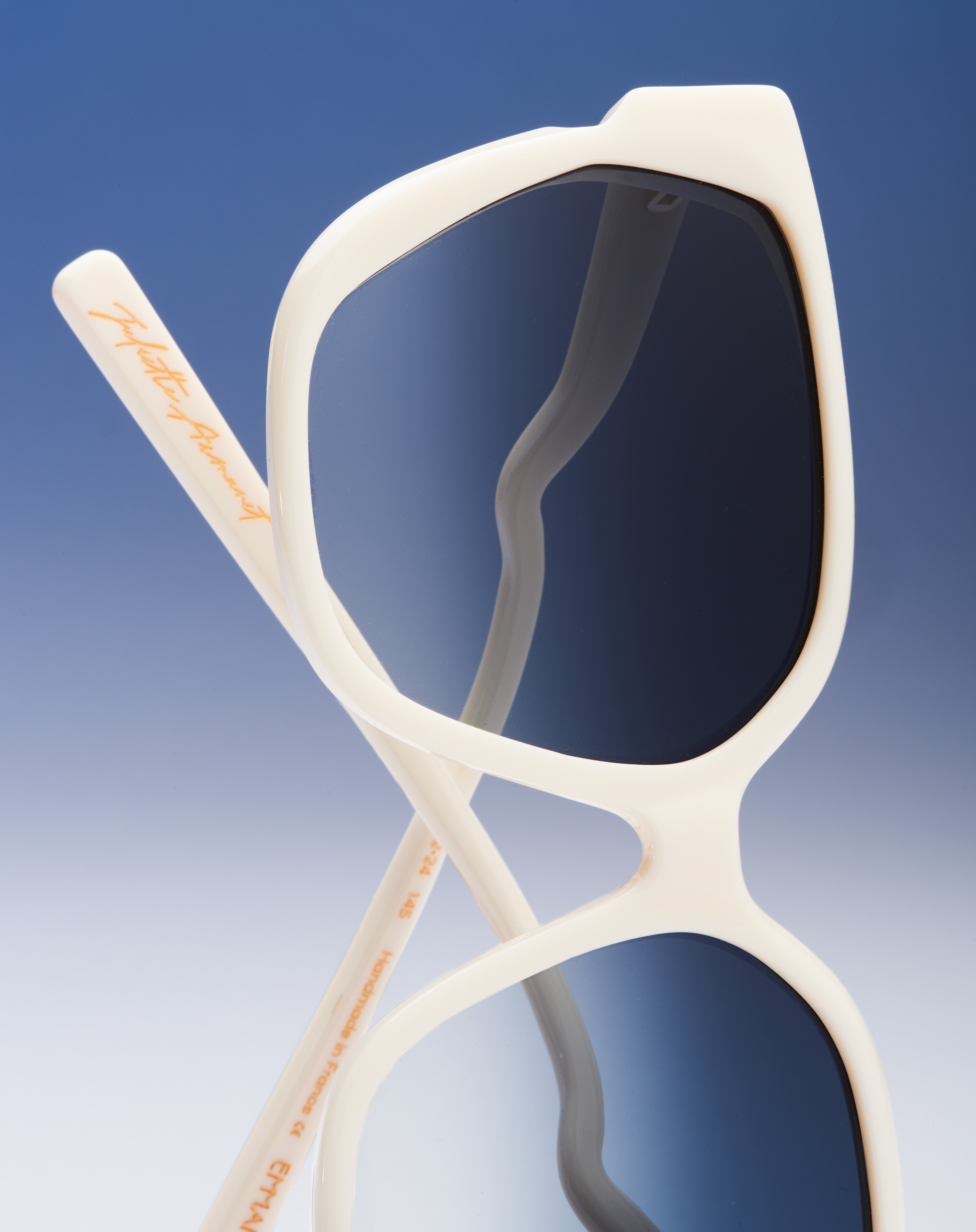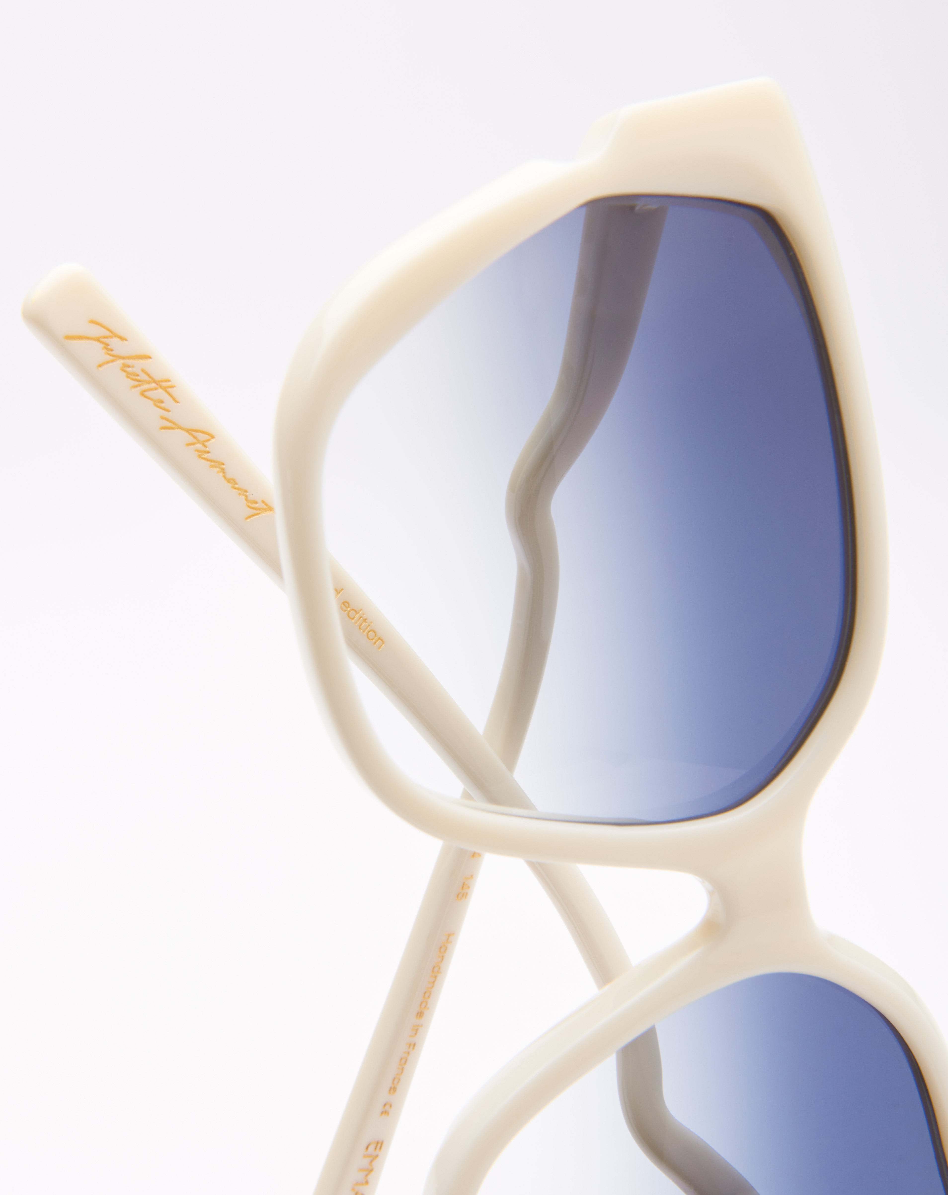 Juliette Armanet a conçu cette paire de solaire comme un objet très glamour, avec d’immenses verres bleus fumés et une monture un peu démesurée, toute en blanc ivoire. Une paire de lunette très racée, qui trouve son inspiration autant chez Polnareff, Christophe, que dans les grandes figures disco. À porter autant de jour que de nuit...
